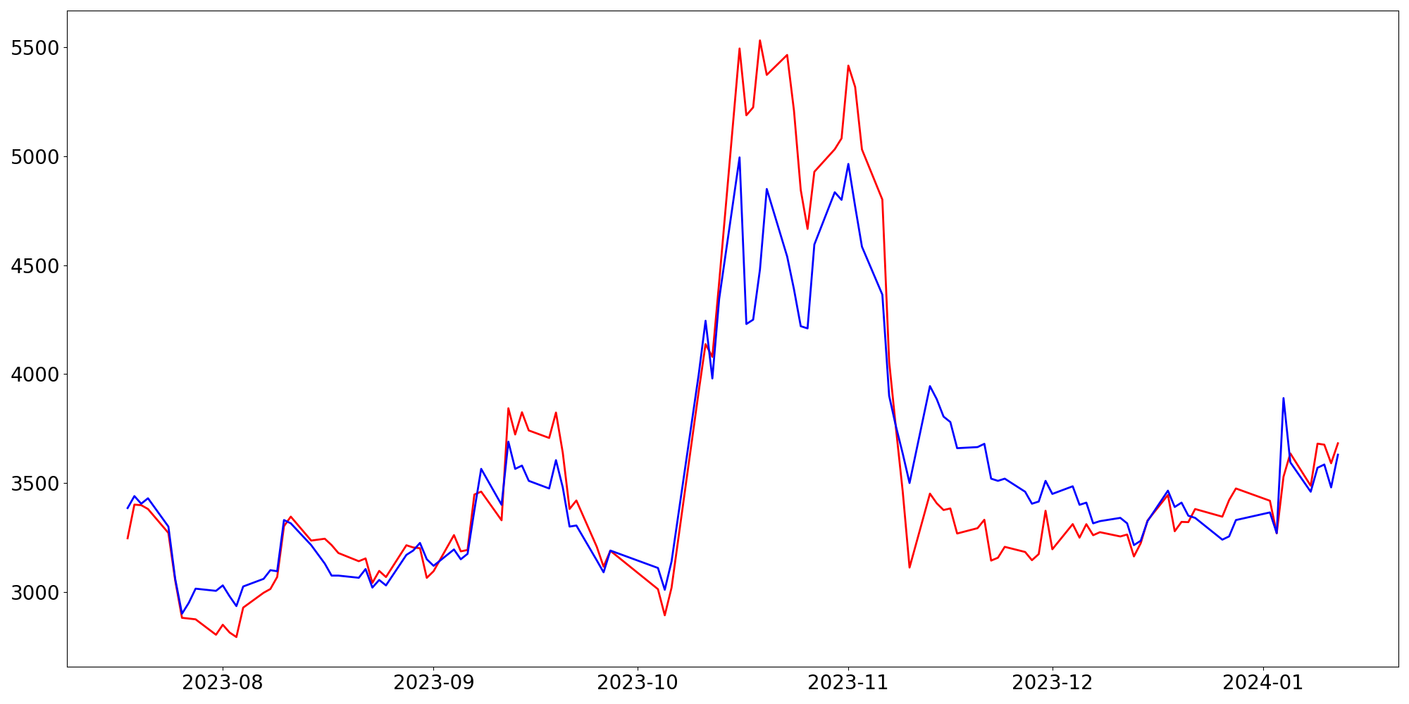[ - : 실제값(종가) / - : 예측값(종가) ]