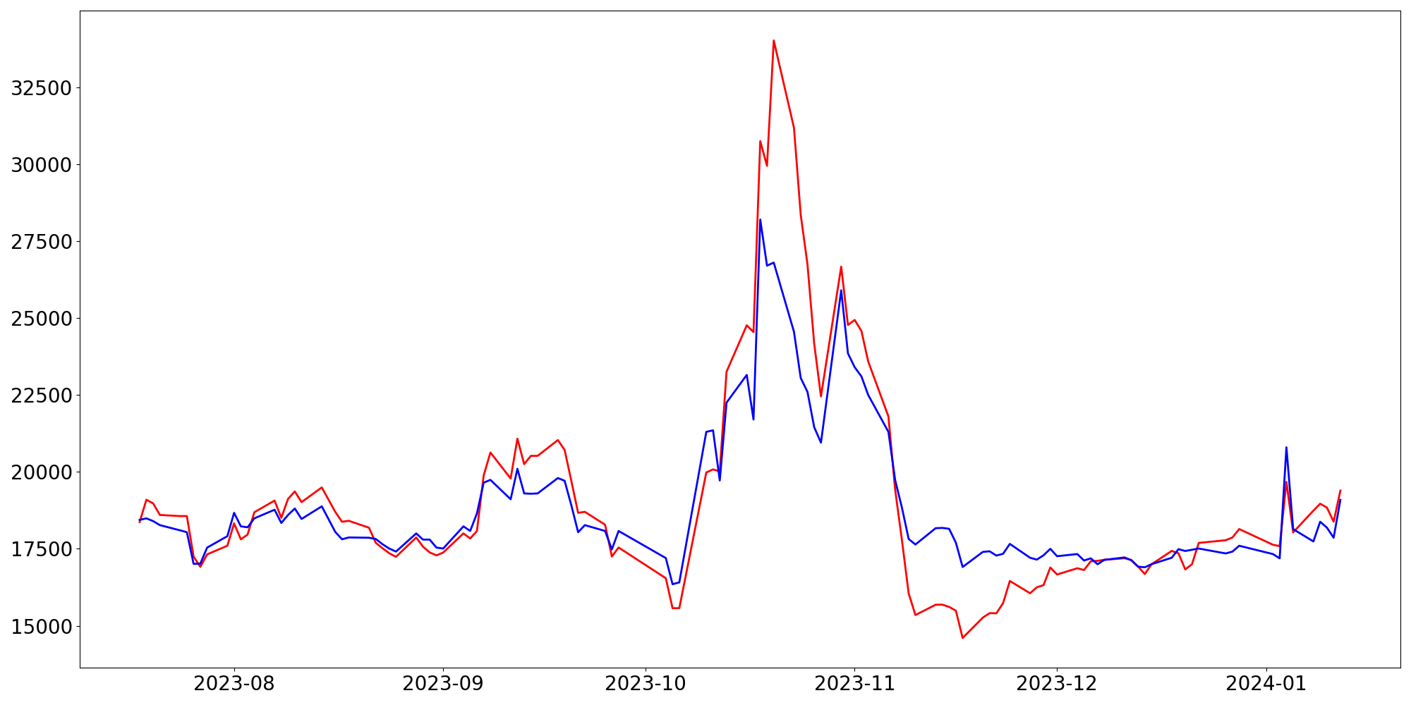 [ - : 실제값(종가) / - : 예측값(종가) ]