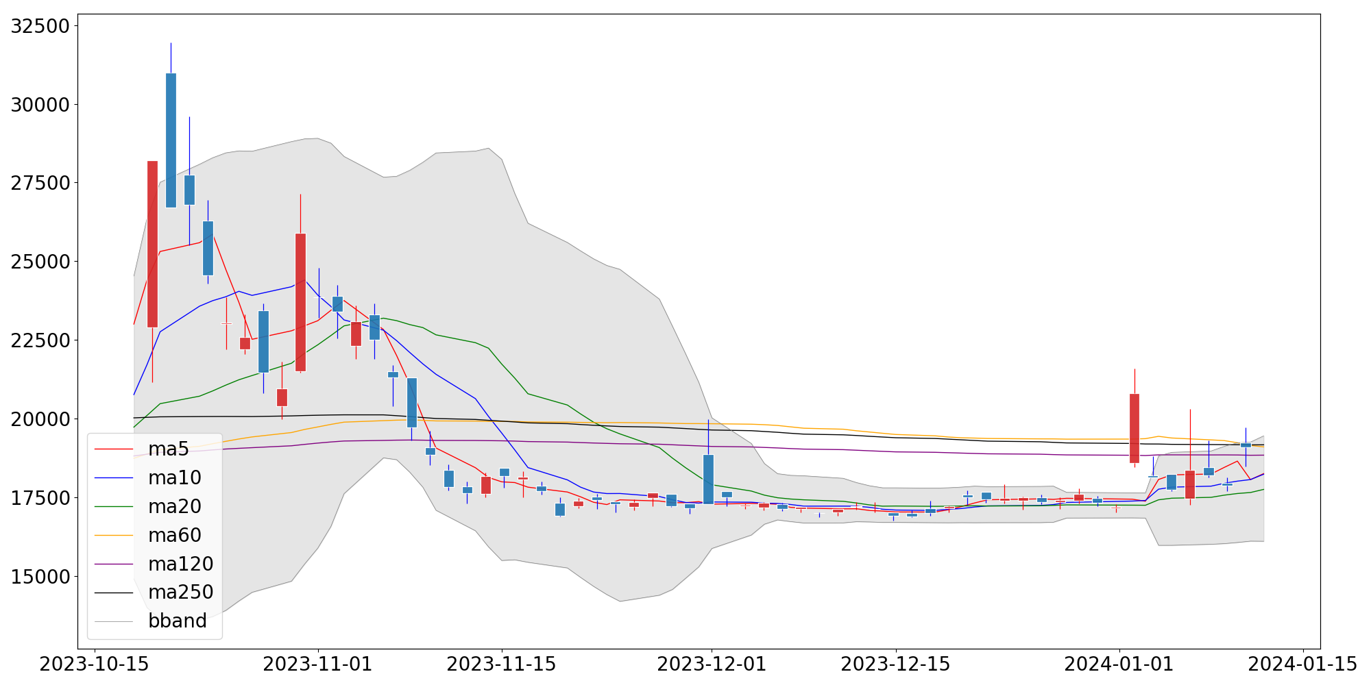 □ 장기 : 현재 종가가 장기(250일) 이동평균값(19,168원)을 하회 하여 장기적 추세 하락 중