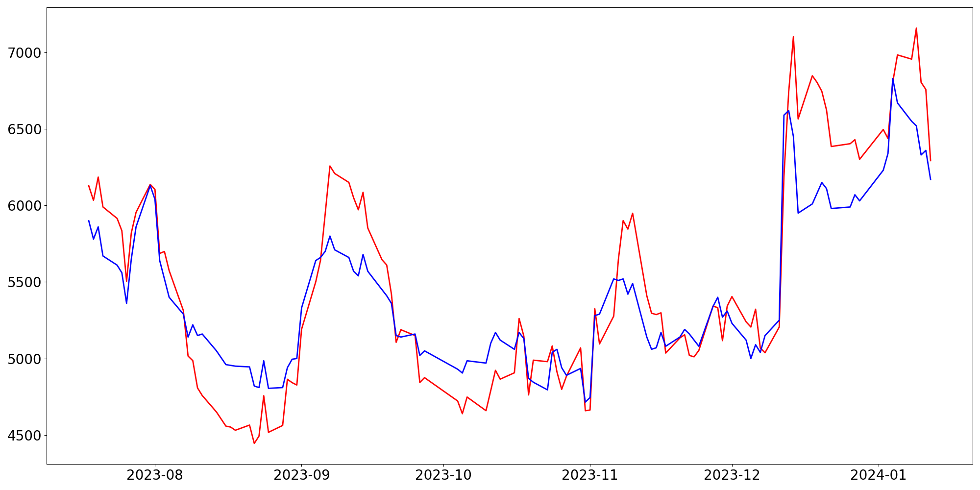 [ - : 실제값(종가) / - : 예측값(종가) ]