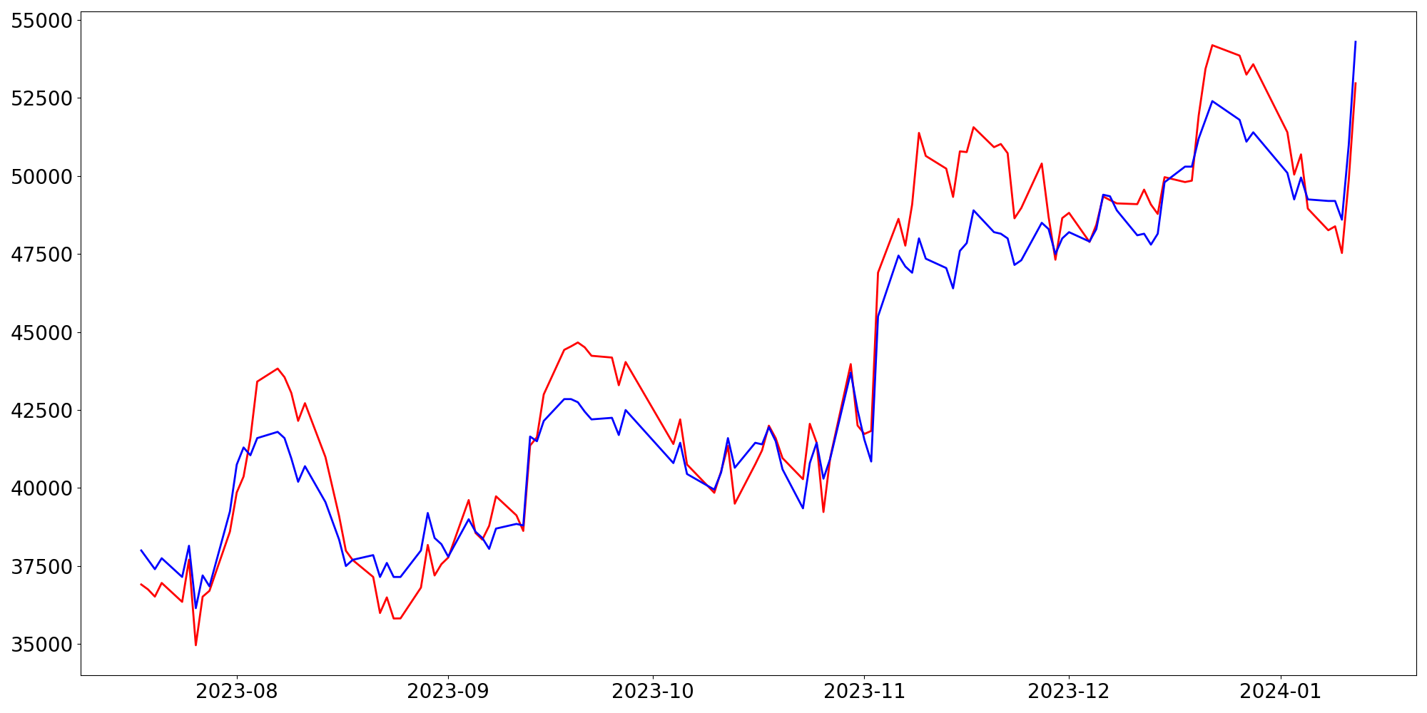 [ - : 실제값(종가) / - : 예측값(종가) ]