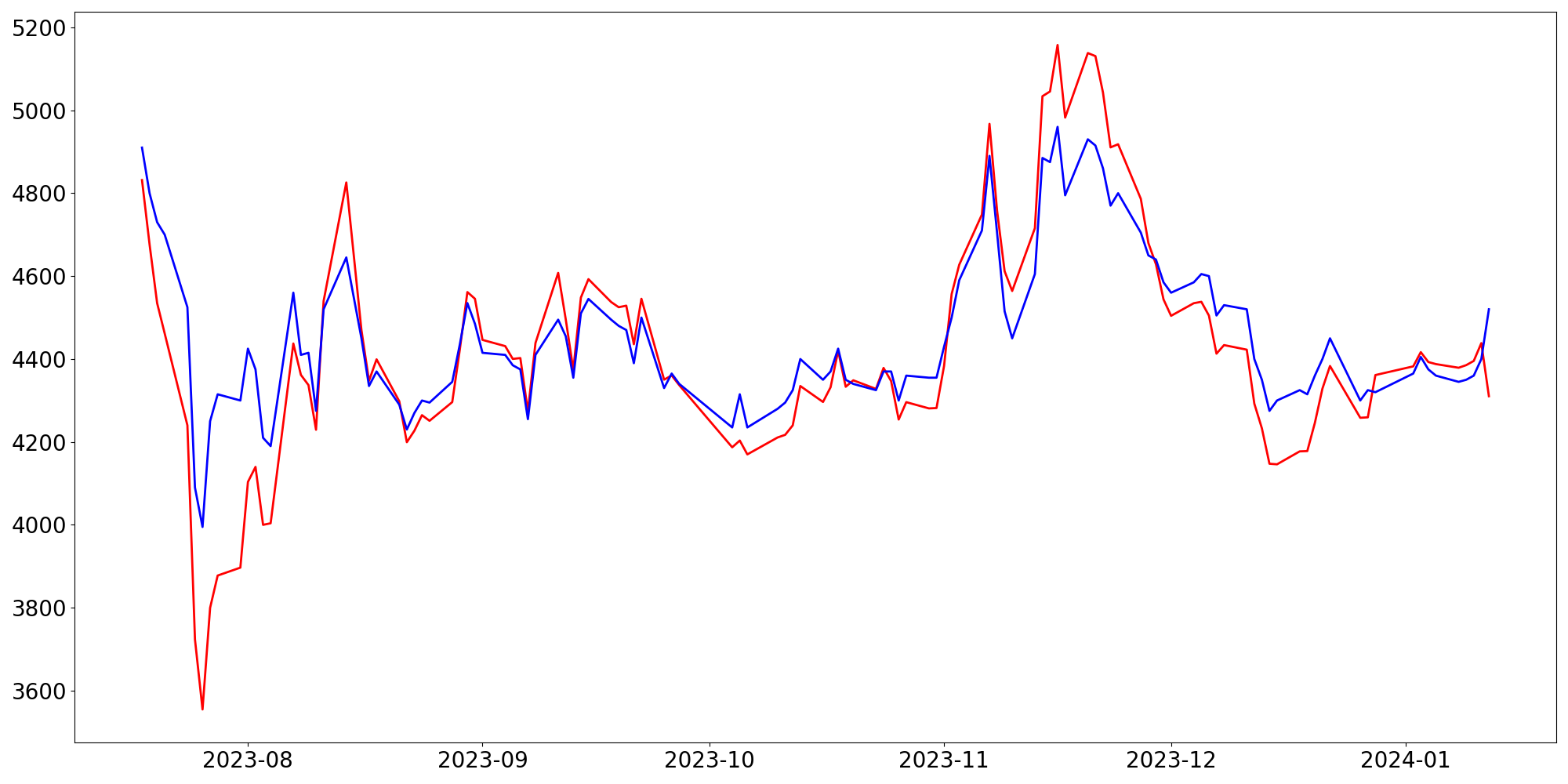 [ - : 실제값(종가) / - : 예측값(종가) ]
