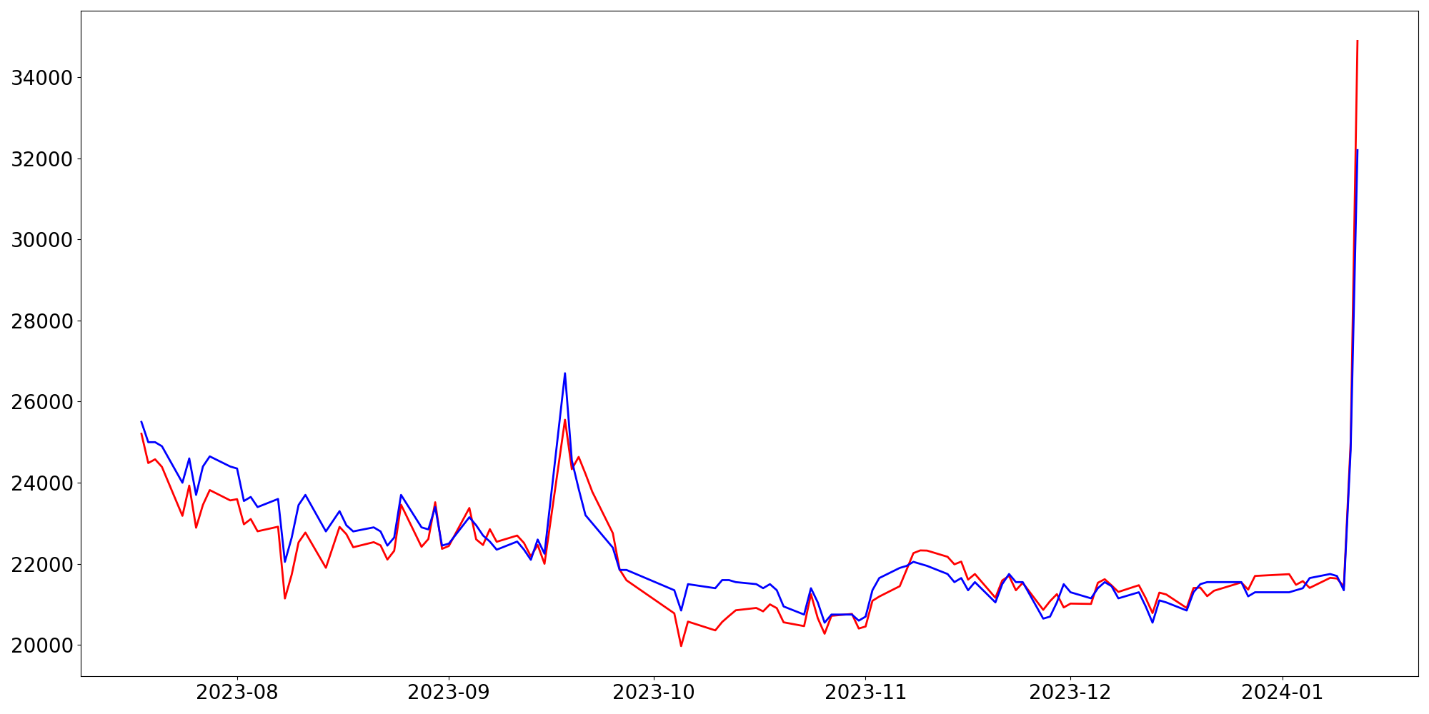 [ - : 실제값(종가) / - : 예측값(종가) ]