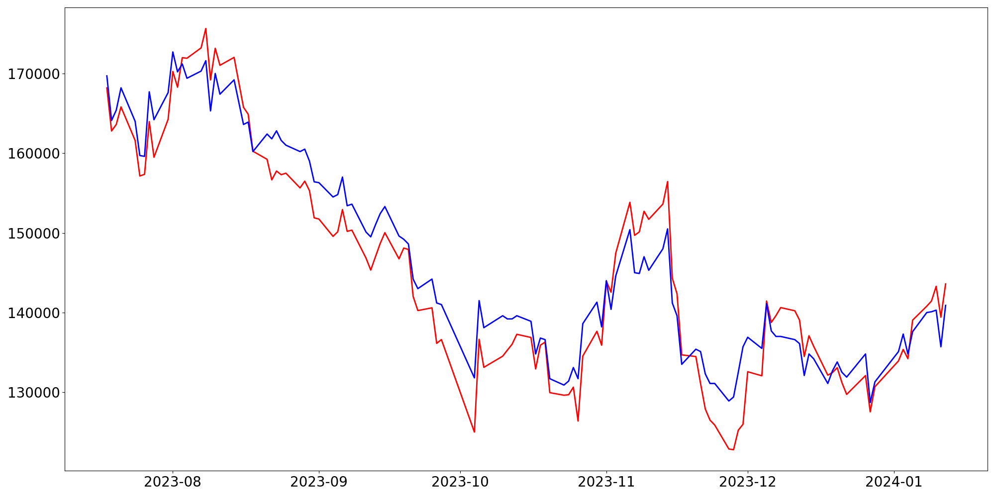 [ - : 실제값(종가) / - : 예측값(종가) ]