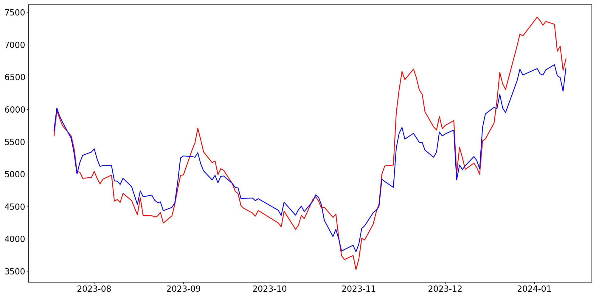 [ - : 실제값(종가) / - : 예측값(종가) ]
