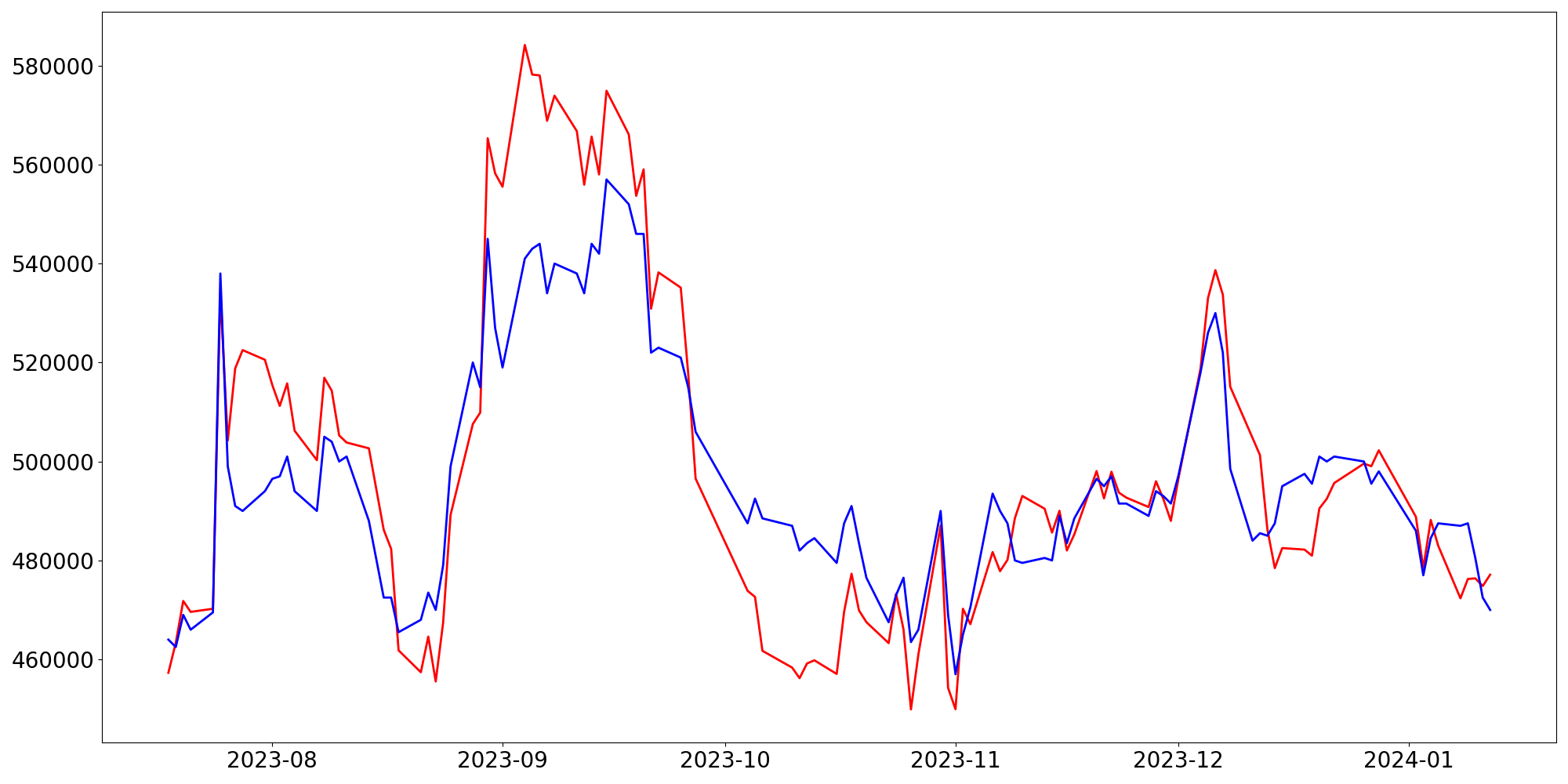 [ - : 실제값(종가) / - : 예측값(종가) ]