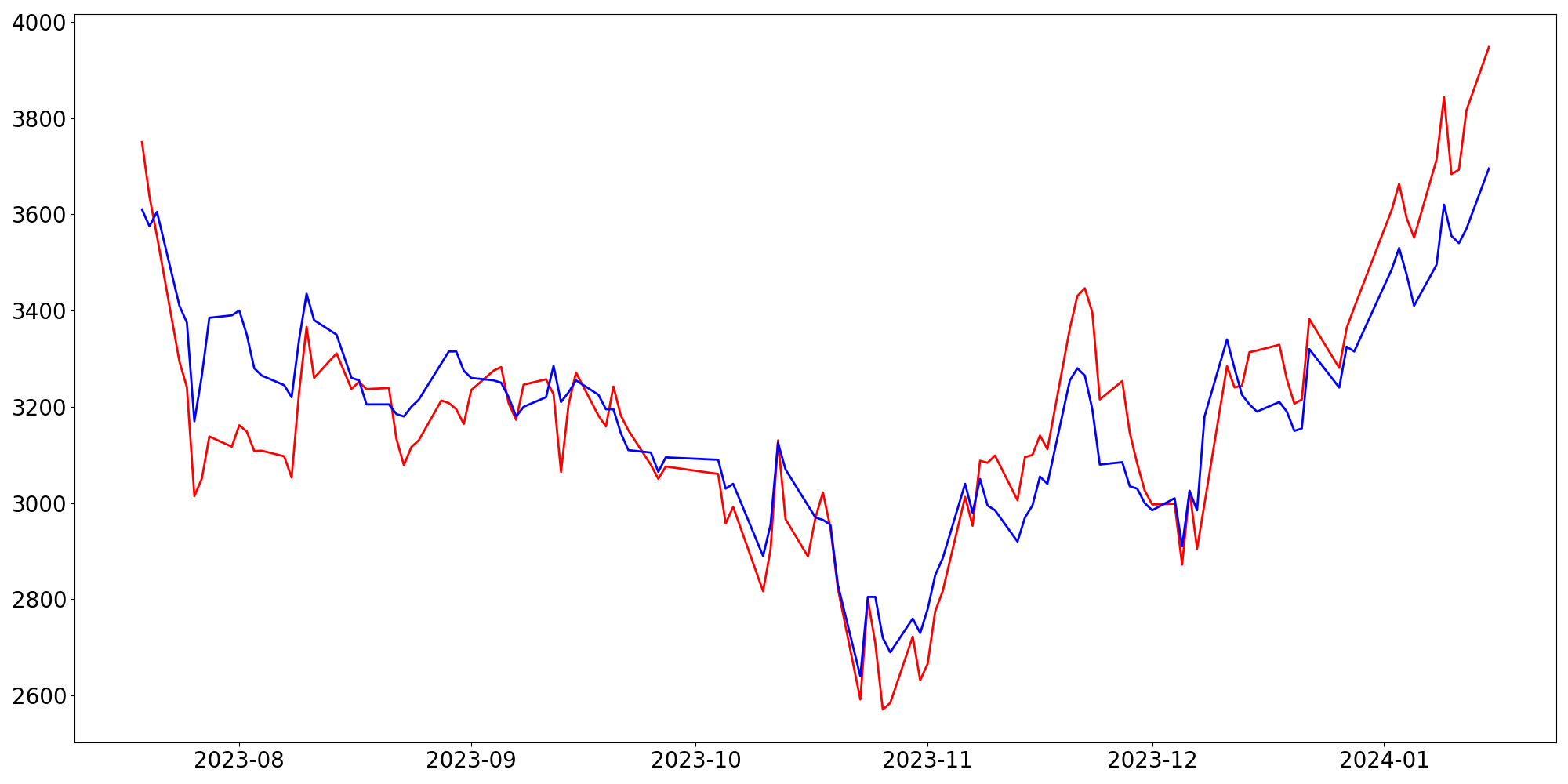 [ - : 실제값(종가) / - : 예측값(종가) ]