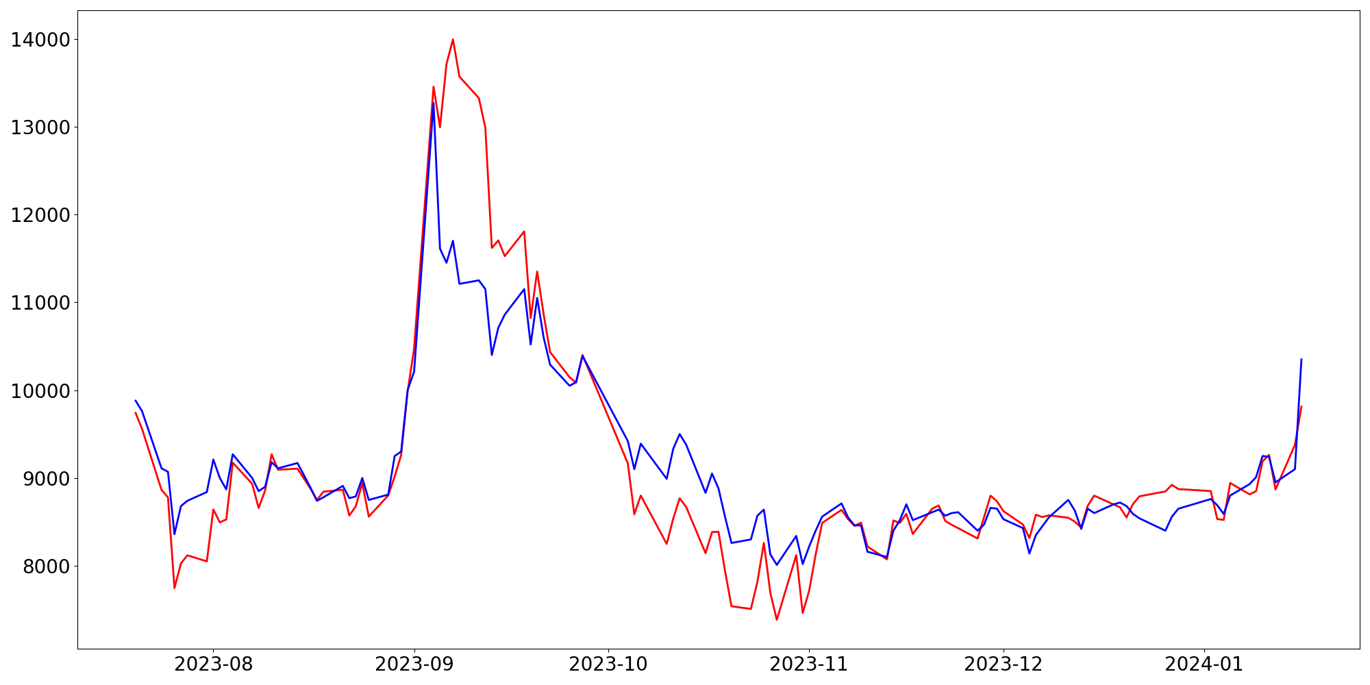[ - : 실제값(종가) / - : 예측값(종가) ]