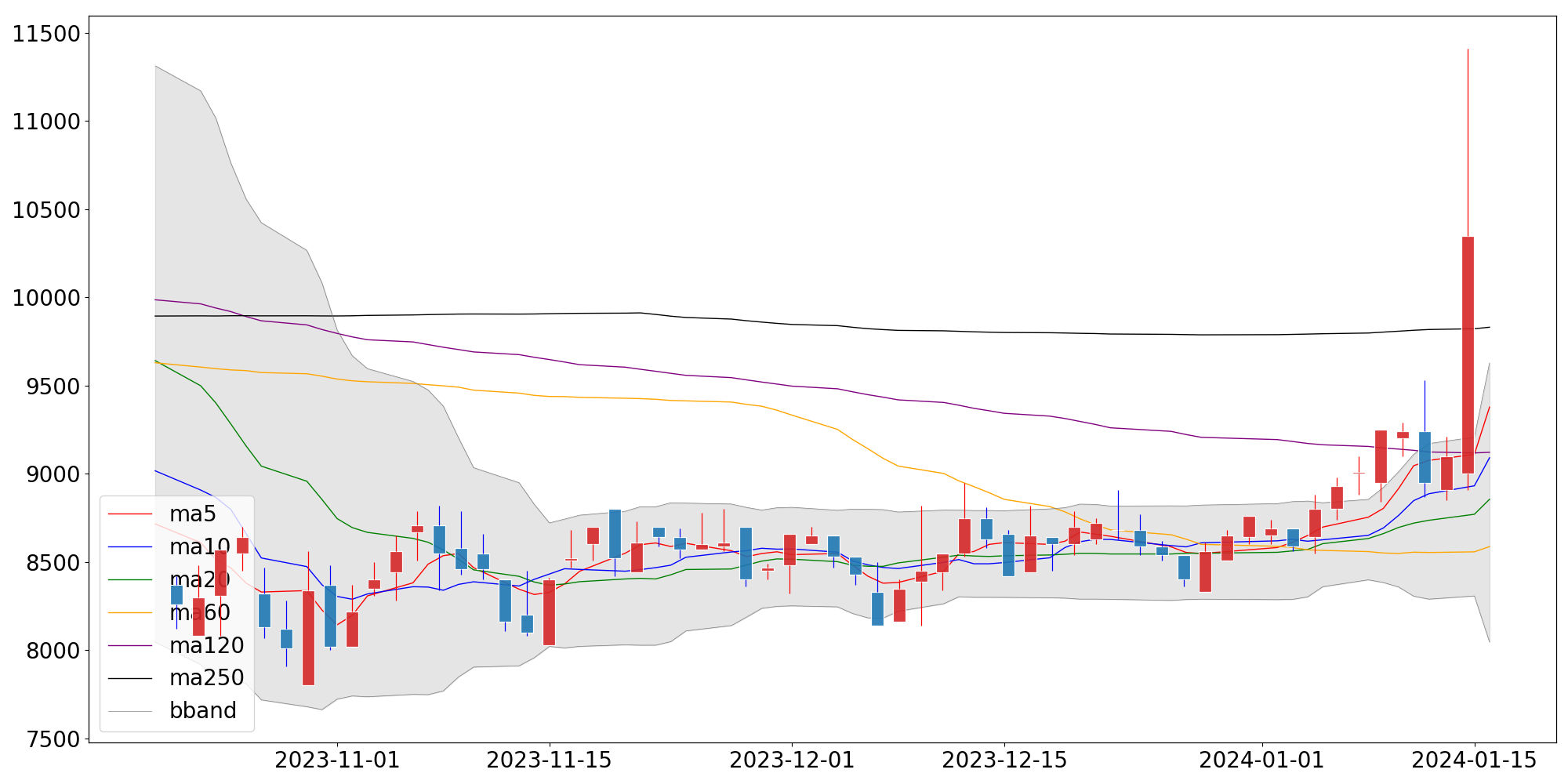 □ 중기 : 현재 종가가 중기(60일) 이동평균값(8,588원)을 상회 하여 중기적 추세 상승 중