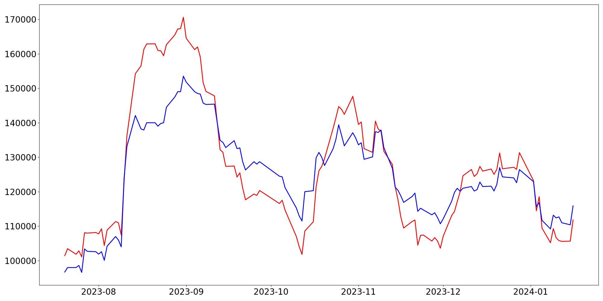 [ - : 실제값(종가) / - : 예측값(종가) ]