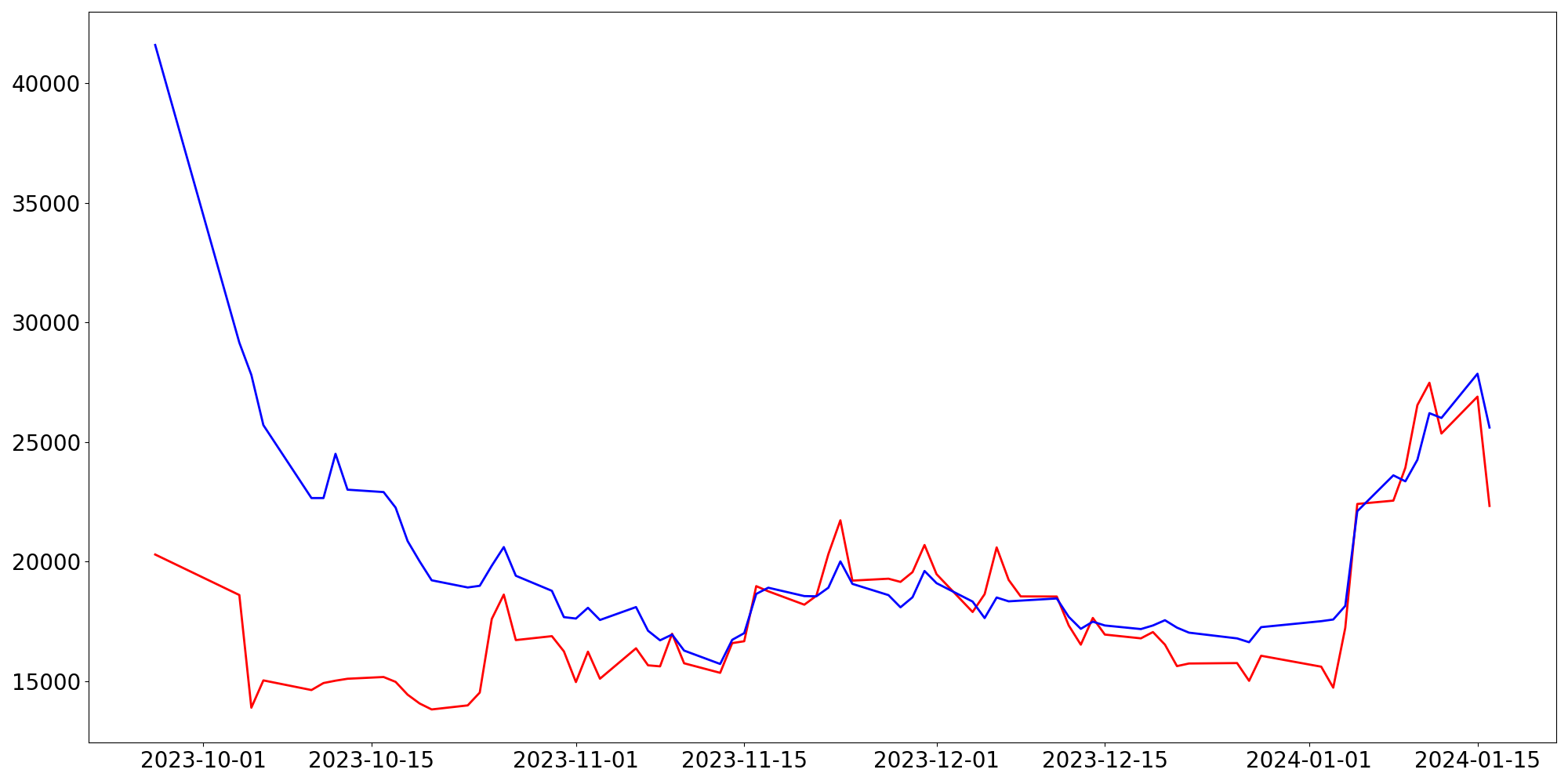 [ - : 실제값(종가) / - : 예측값(종가) ]