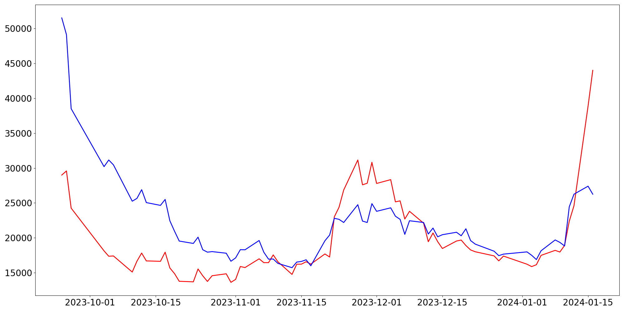 [ - : 실제값(종가) / - : 예측값(종가) ]