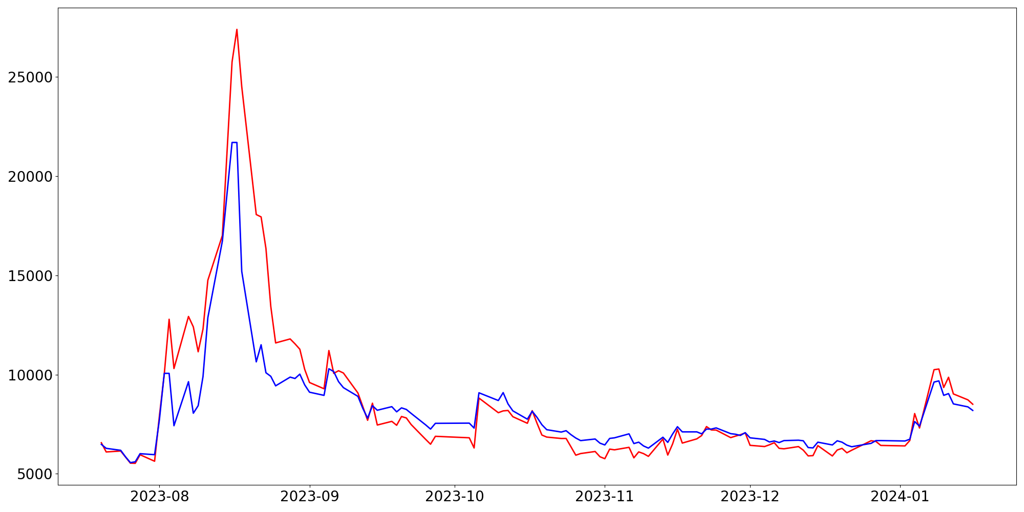 [ - : 실제값(종가) / - : 예측값(종가) ]