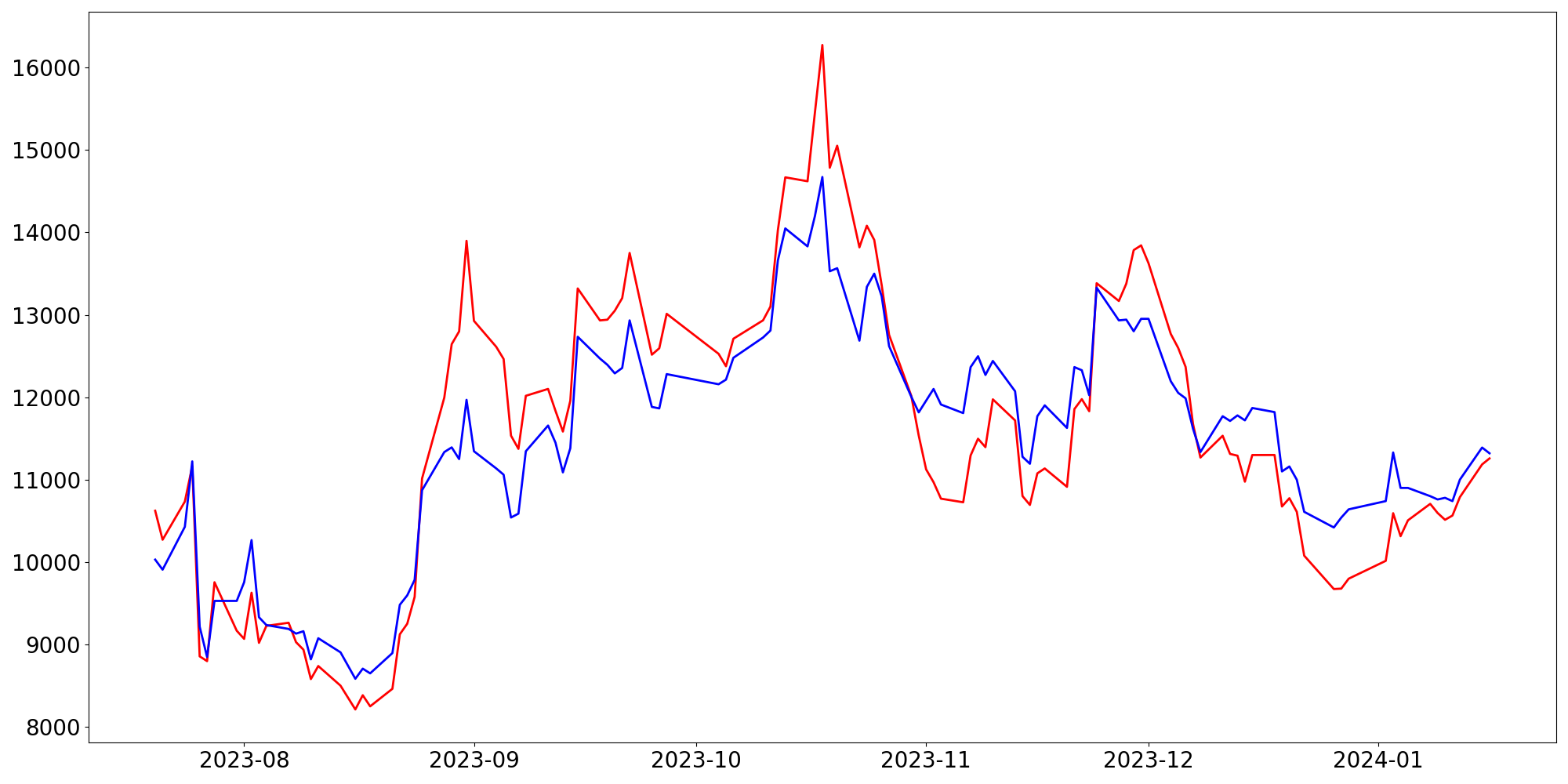 [ - : 실제값(종가) / - : 예측값(종가) ]