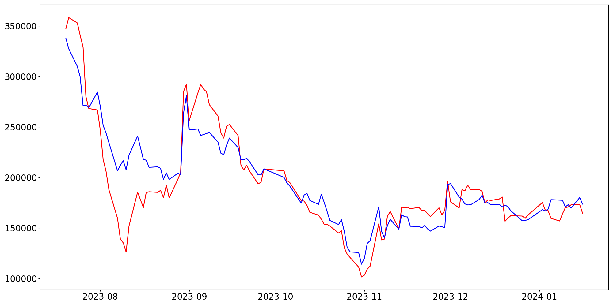 [ - : 실제값(종가) / - : 예측값(종가) ]