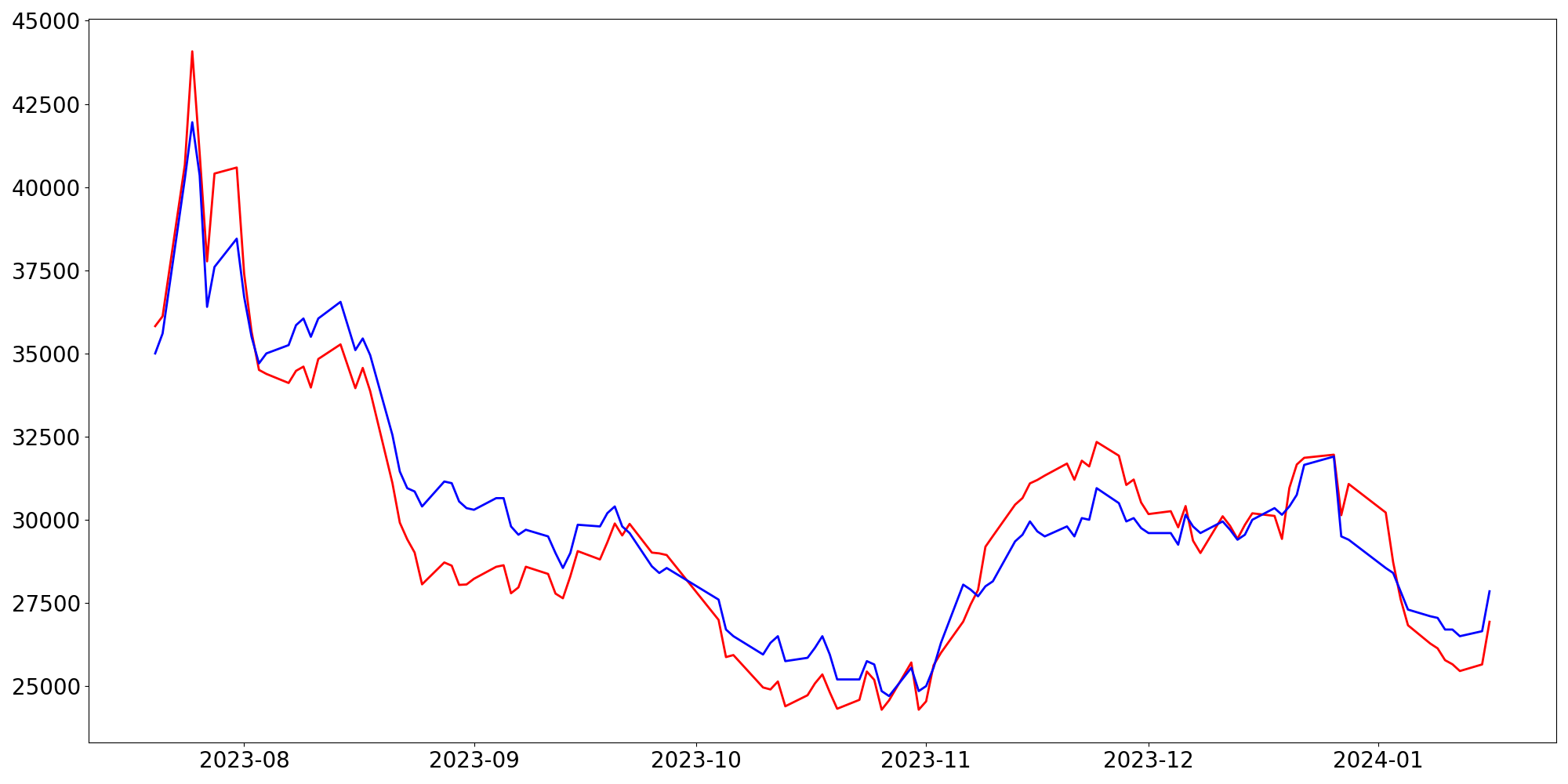 [ - : 실제값(종가) / - : 예측값(종가) ]