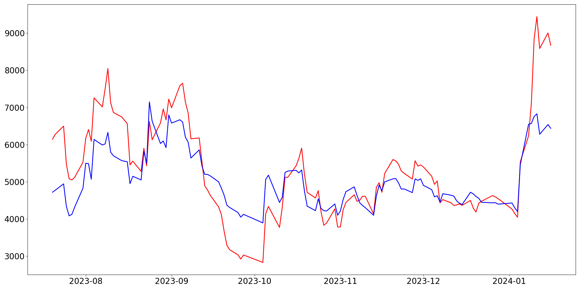 [ - : 실제값(종가) / - : 예측값(종가) ]