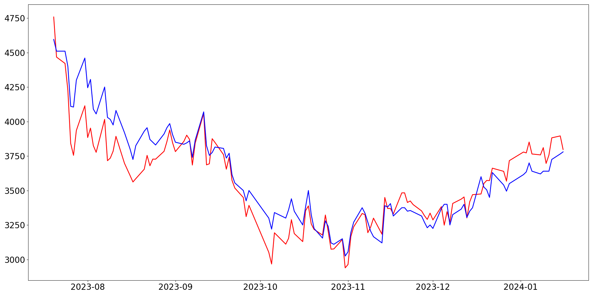 [ - : 실제값(종가) / - : 예측값(종가) ]