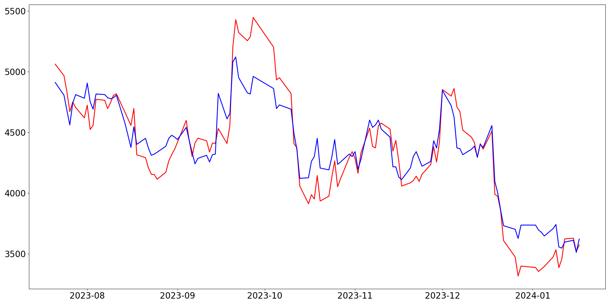 [ - : 실제값(종가) / - : 예측값(종가) ]