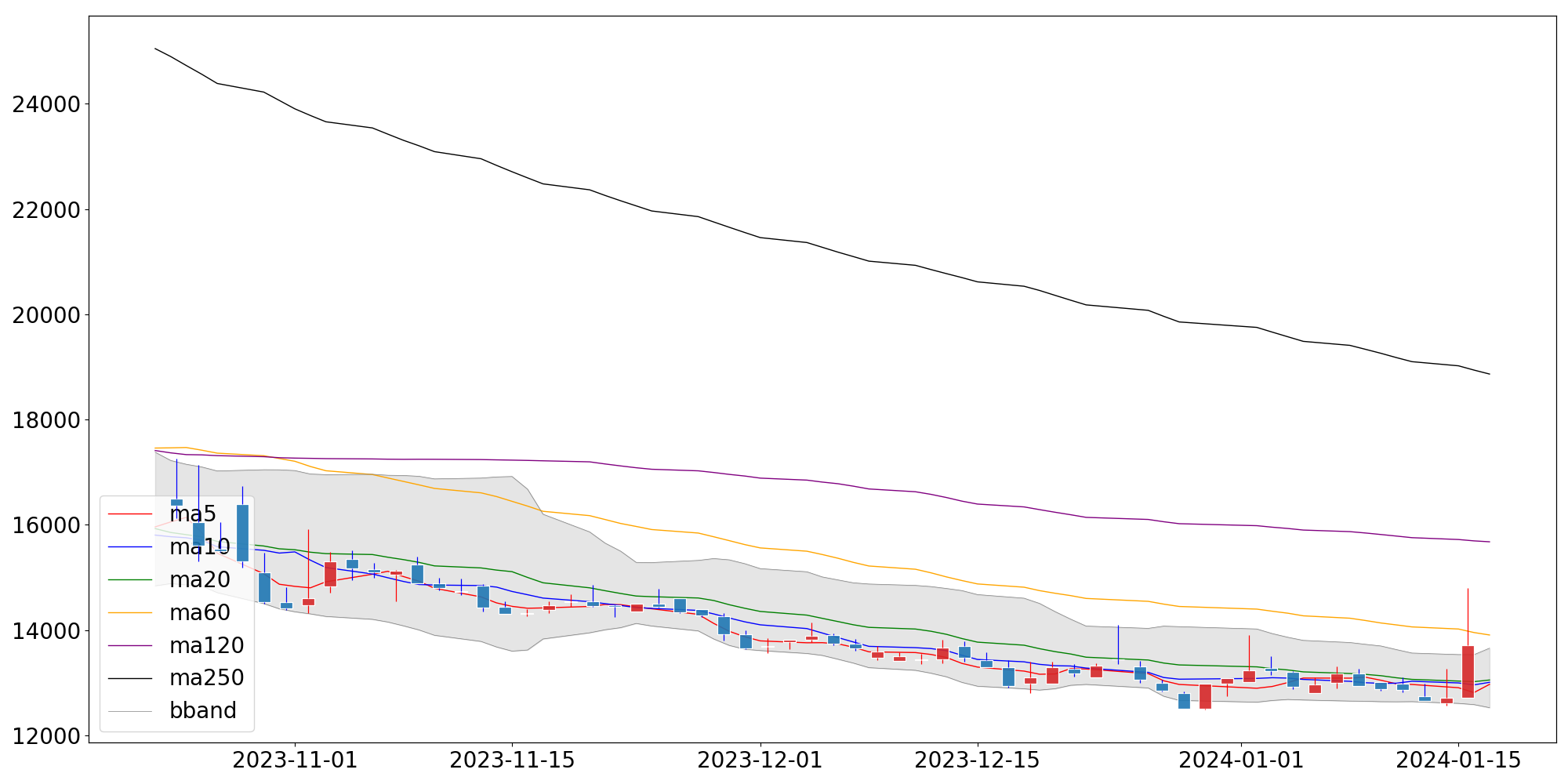 □ 중기 : 현재 종가가 중기(60일) 이동평균값(13,908원)을 하회 하여 중기적 추세 하락 중