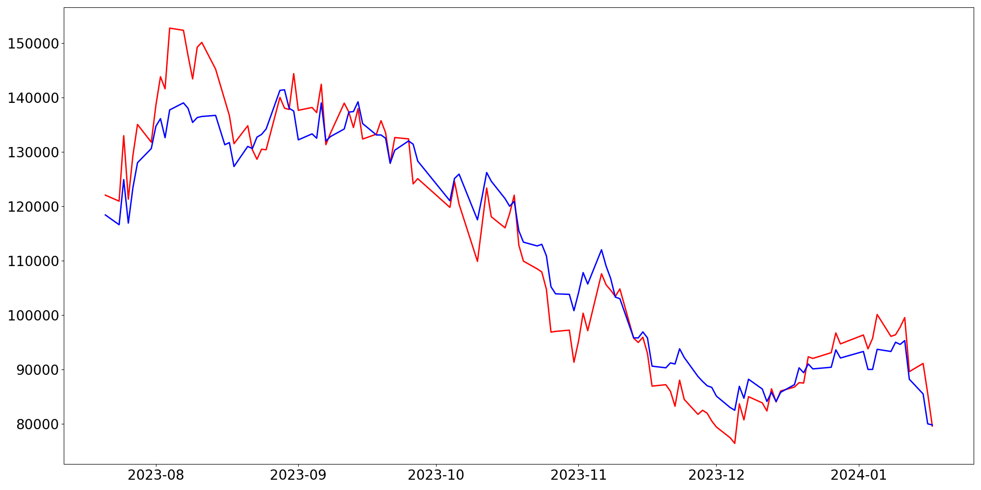 [ - : 실제값(종가) / - : 예측값(종가) ]