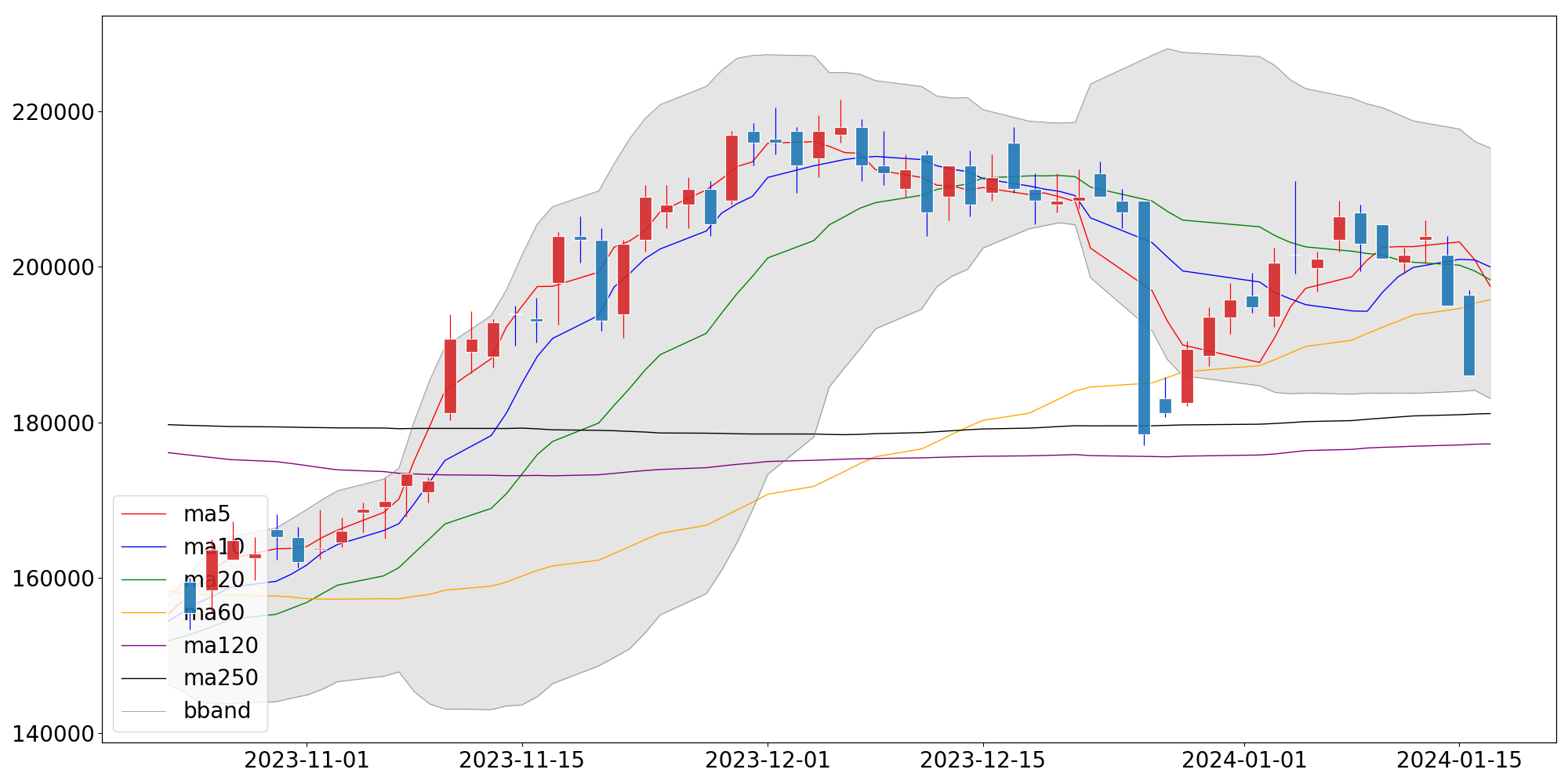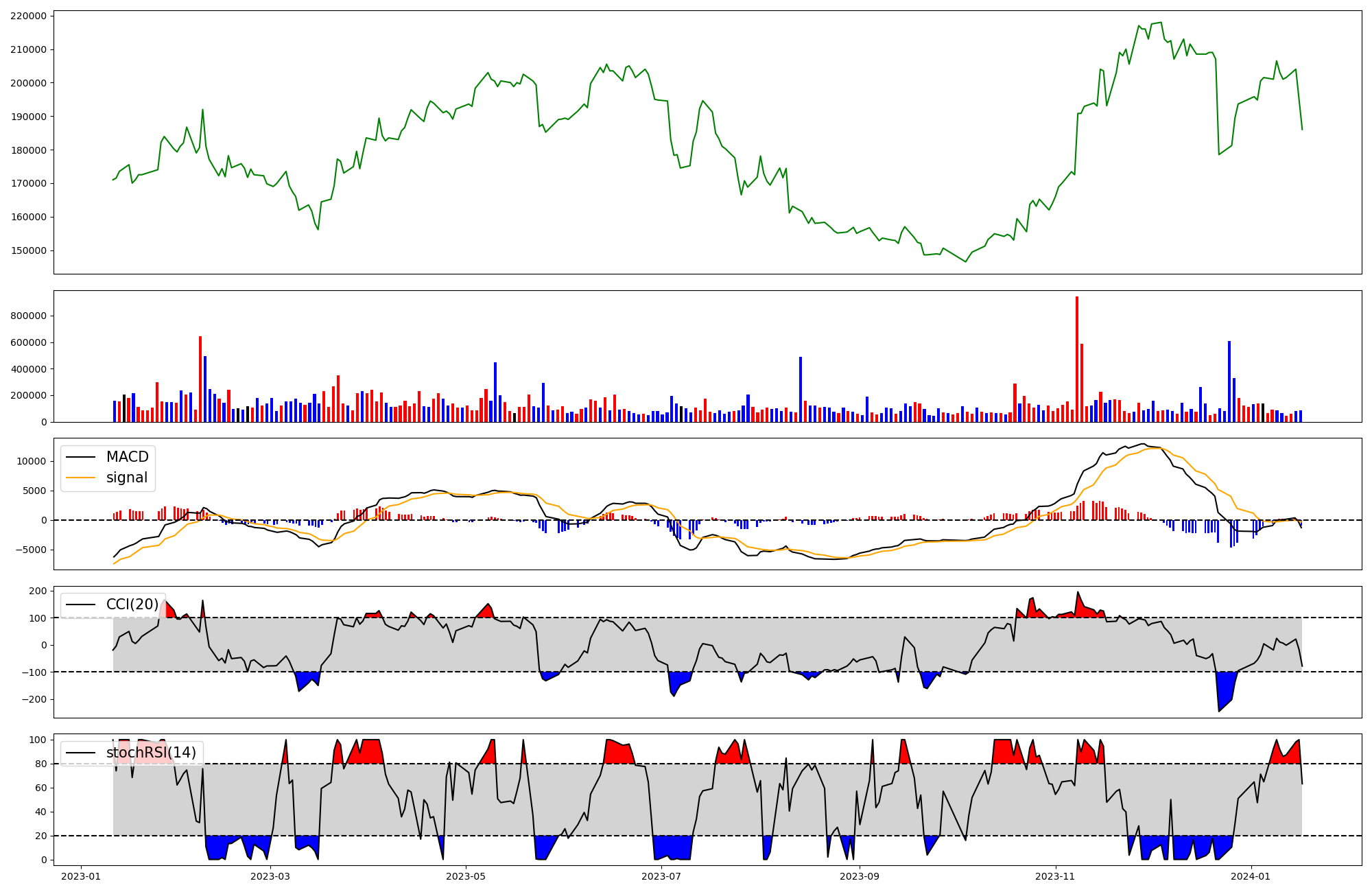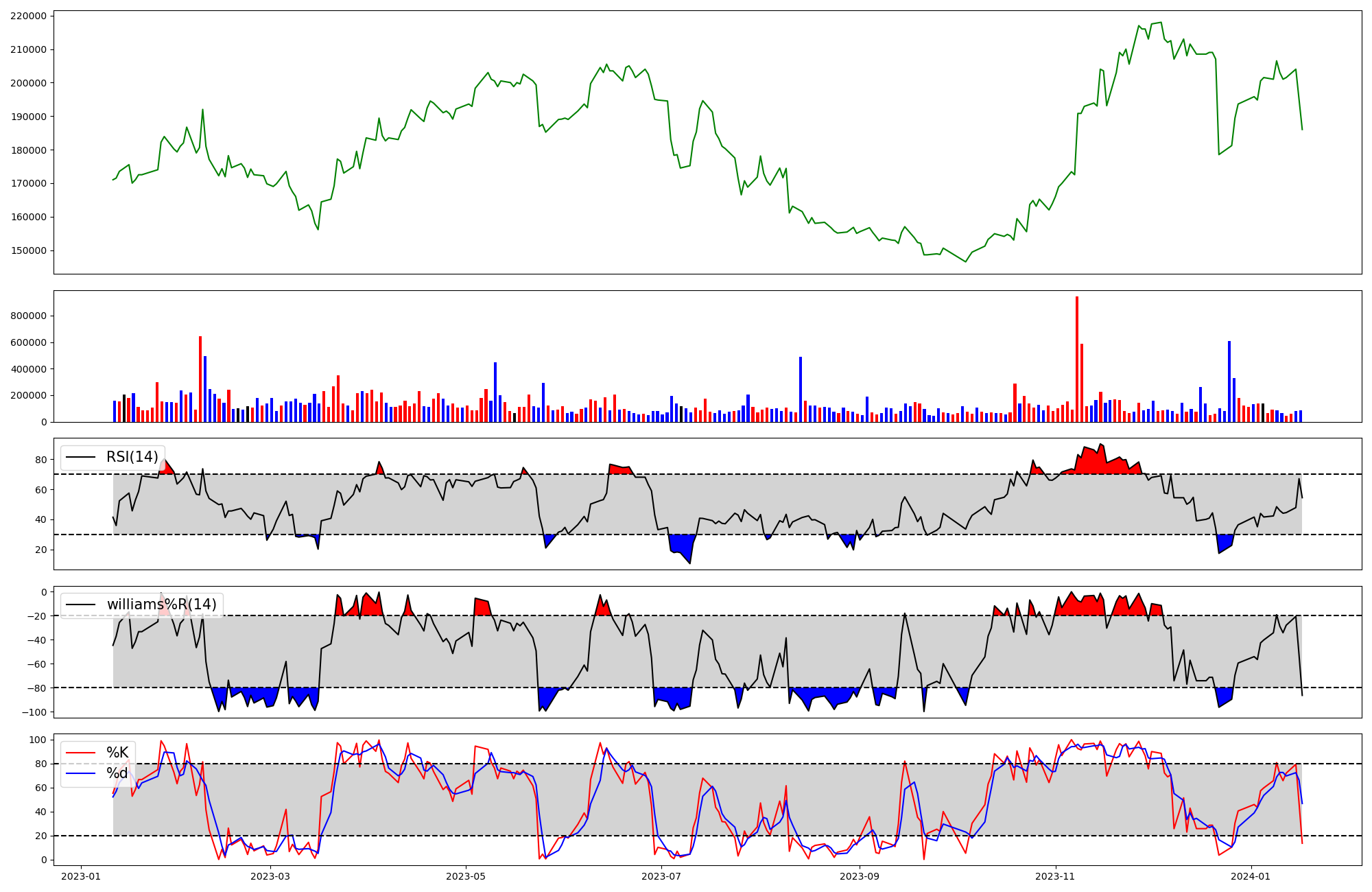 □ 중기 : 현재 종가가 중기(60일) 이동평균값(195,767원)을 하회 하여 중기적 추세 하락 중