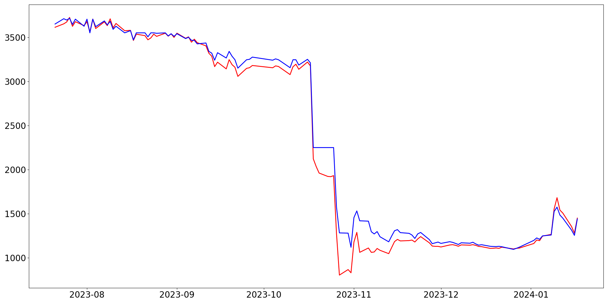 [ - : 실제값(종가) / - : 예측값(종가) ]