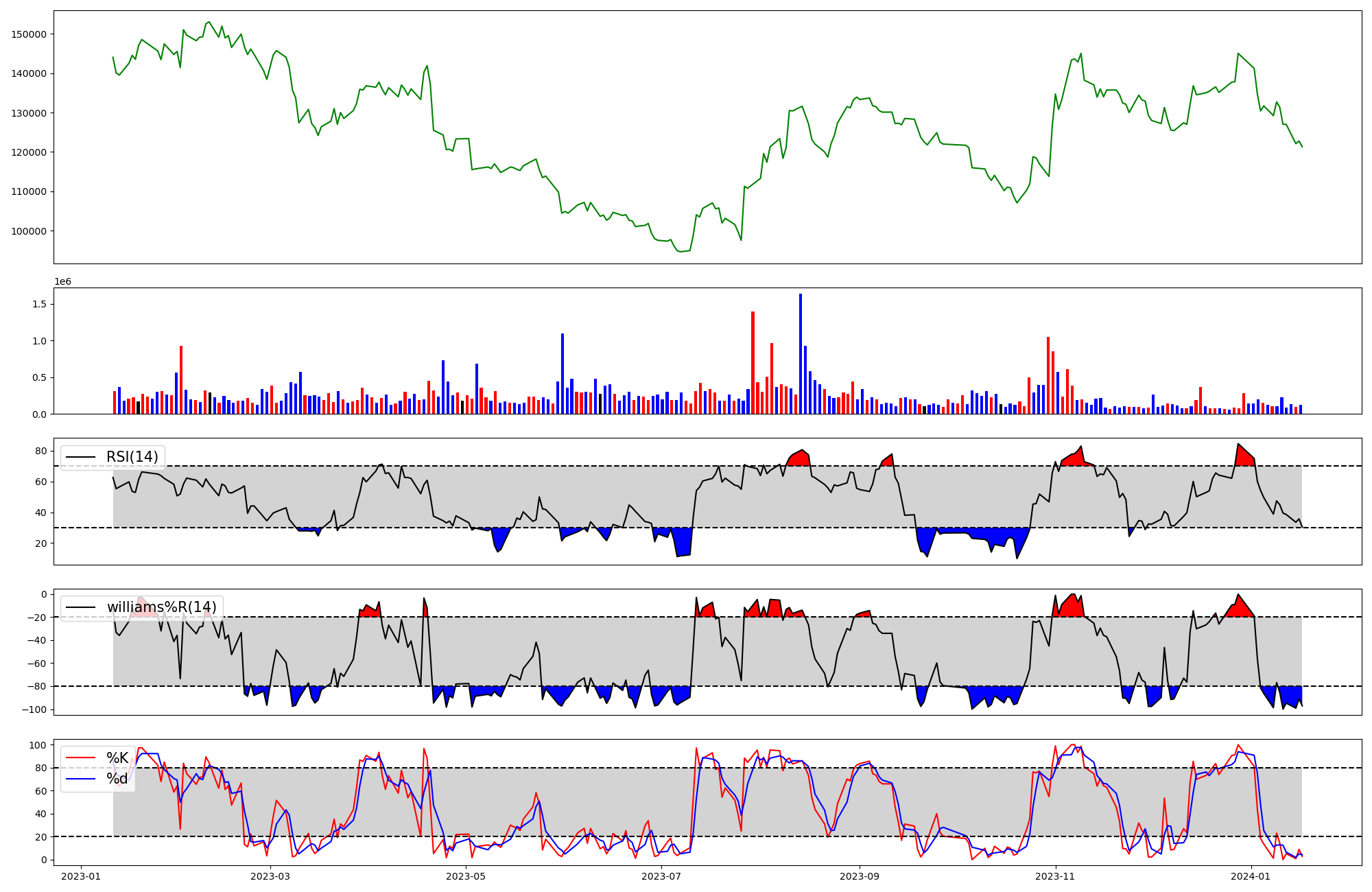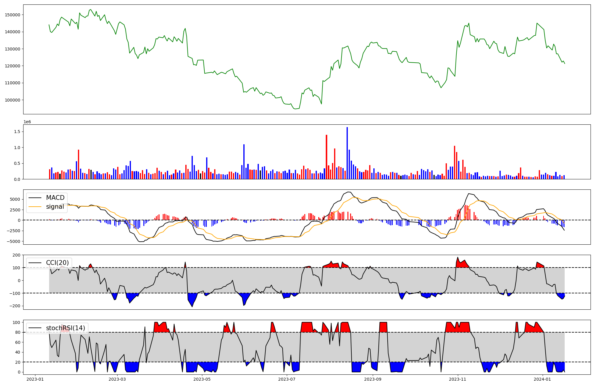 □ 중기 : 현재 종가가 중기(60일) 이동평균값(131,212원)을 하회 하여 중기적 추세 하락 중