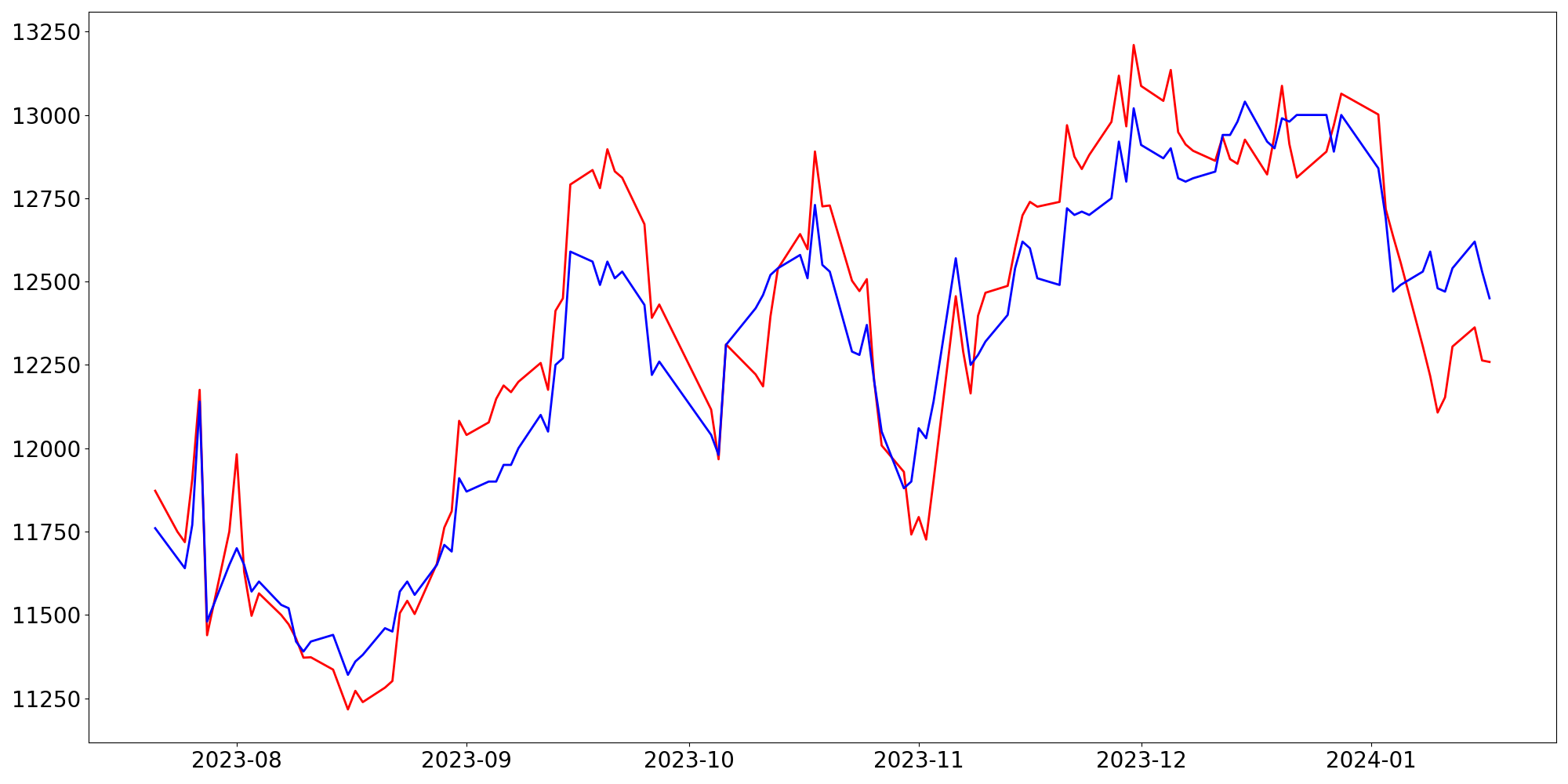 [ - : 실제값(종가) / - : 예측값(종가) ]