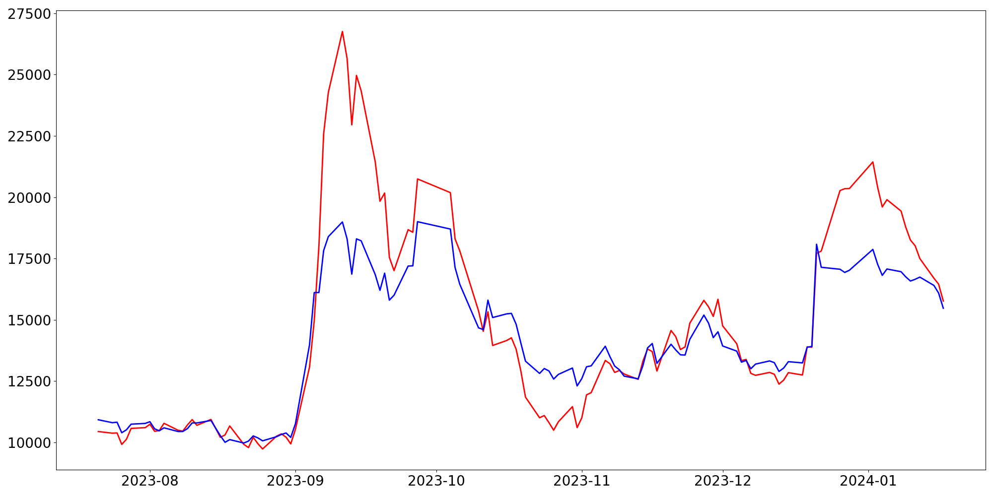 [ - : 실제값(종가) / - : 예측값(종가) ]