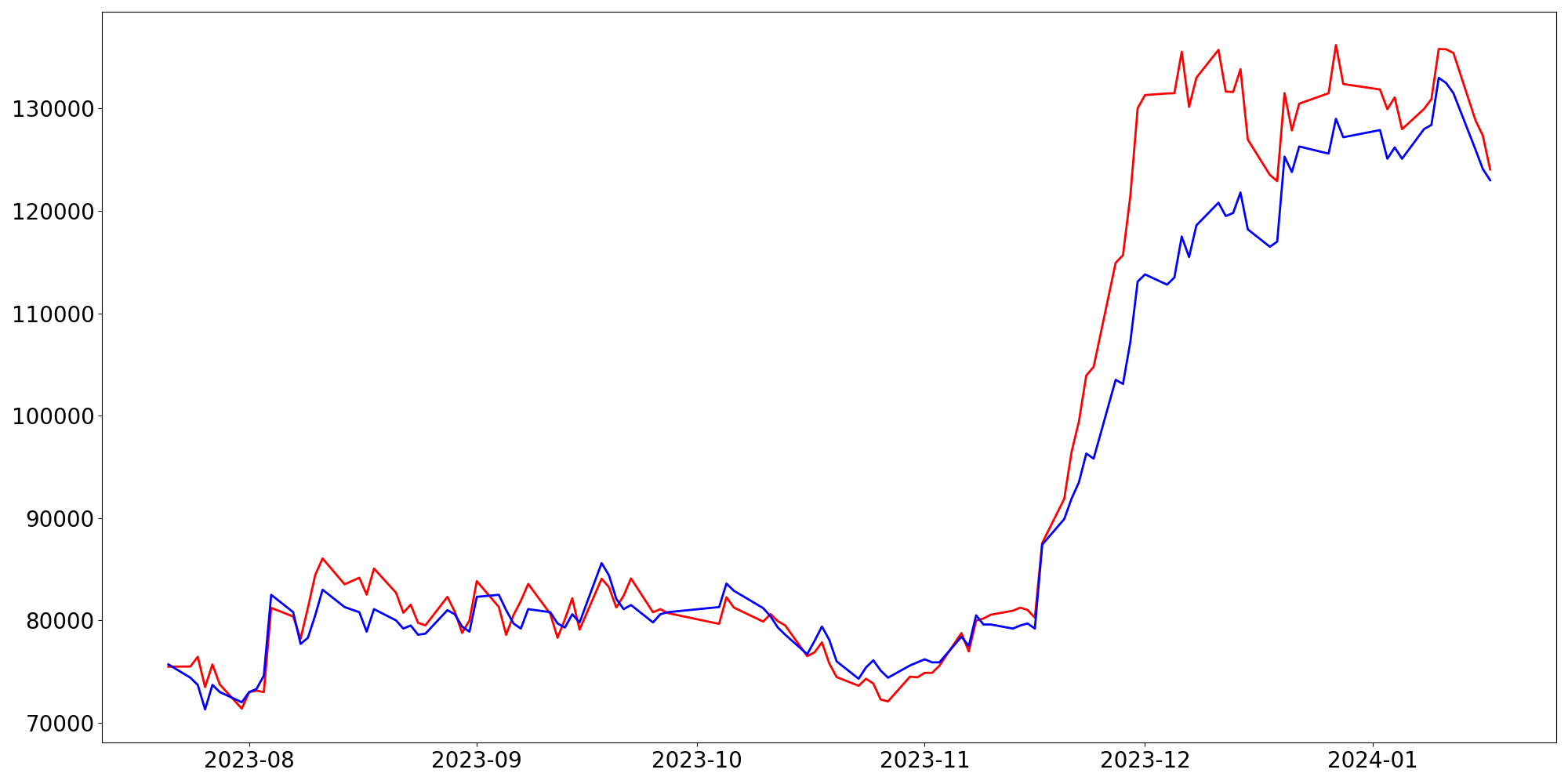[ - : 실제값(종가) / - : 예측값(종가) ]