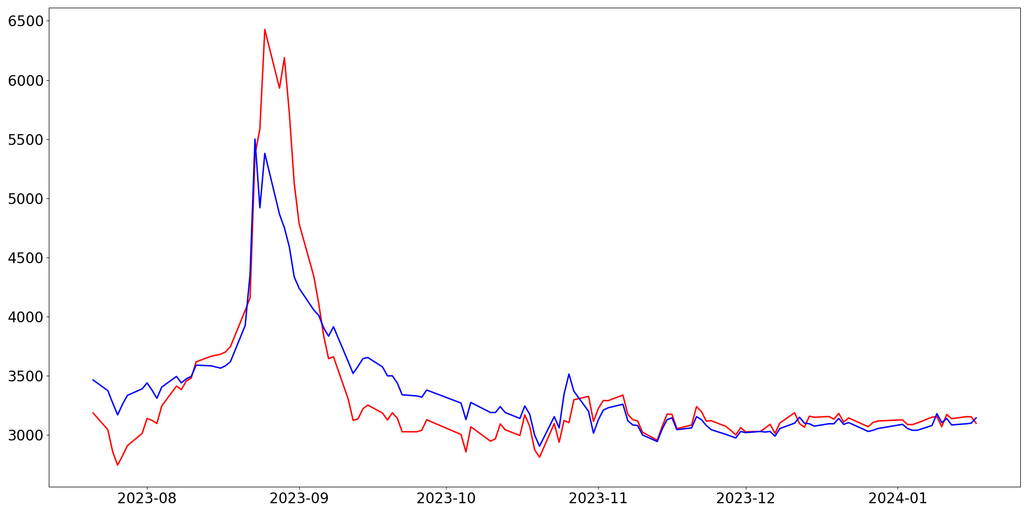 [ - : 실제값(종가) / - : 예측값(종가) ]