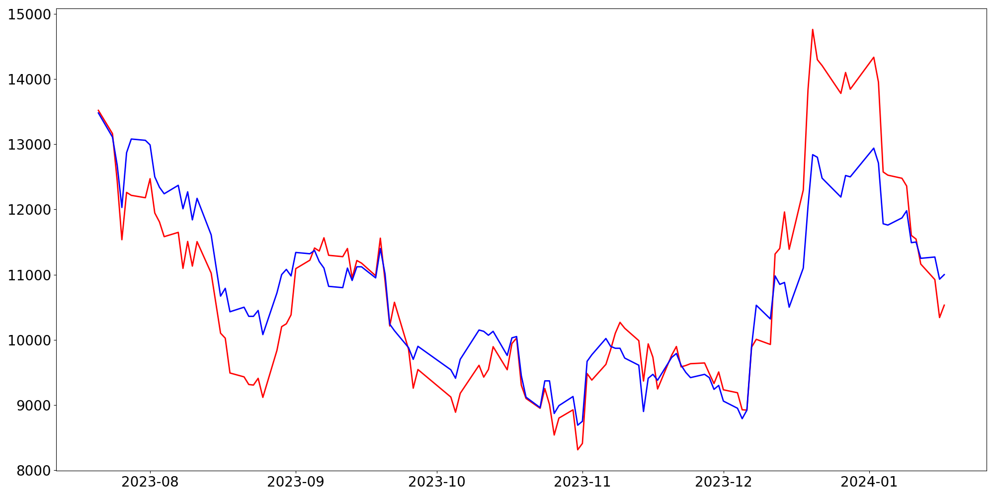 [ - : 실제값(종가) / - : 예측값(종가) ]