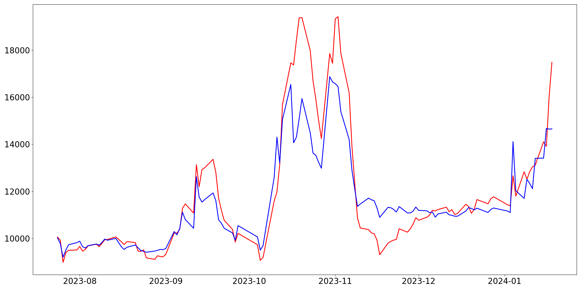 [ - : 실제값(종가) / - : 예측값(종가) ]