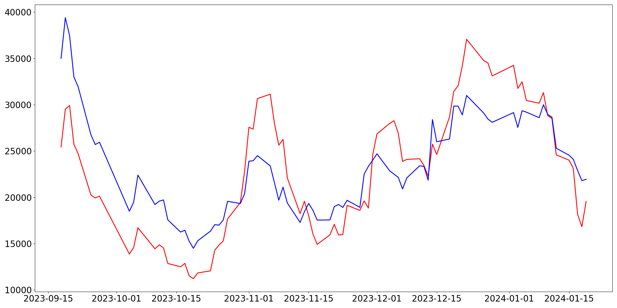 [ - : 실제값(종가) / - : 예측값(종가) ]