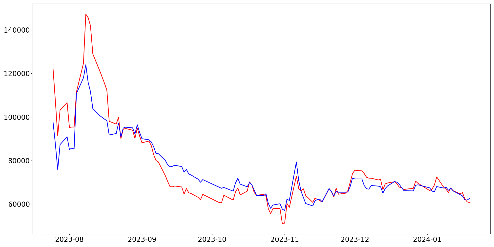 [ - : 실제값(종가) / - : 예측값(종가) ]