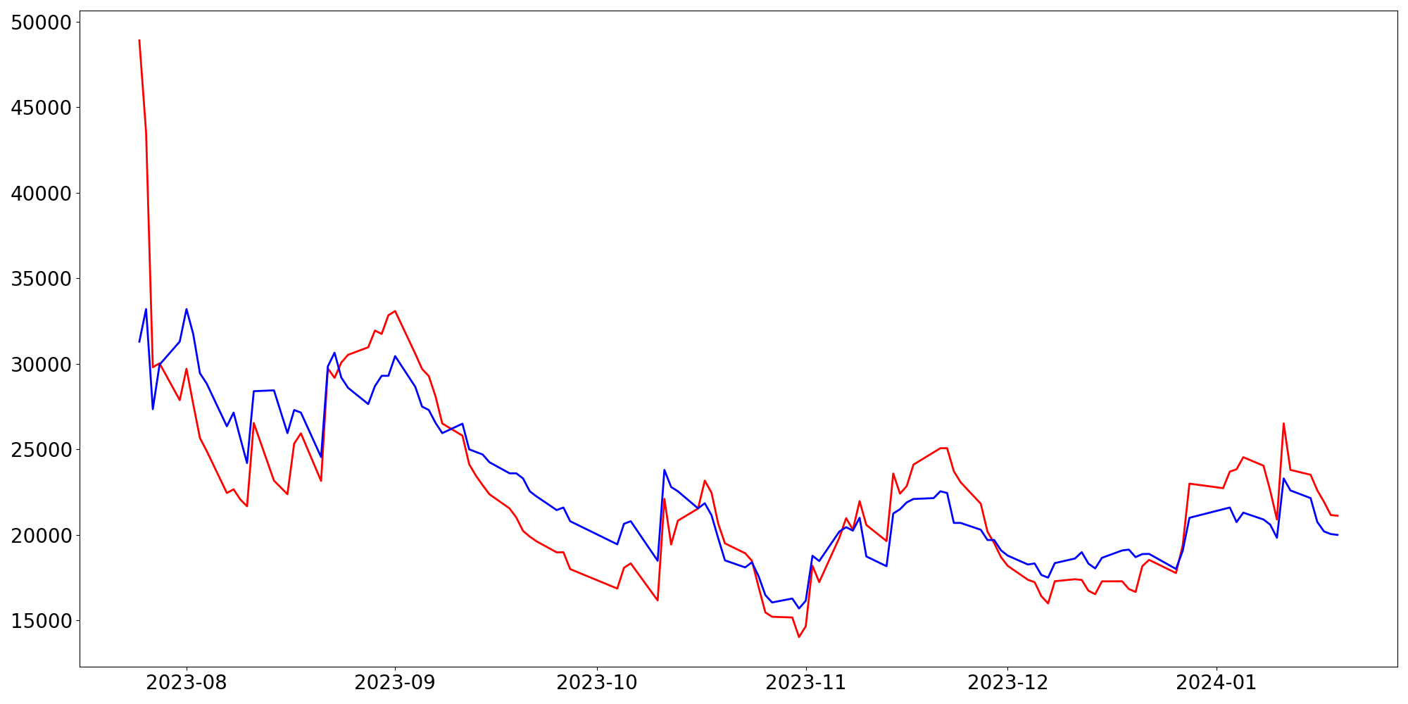 [ - : 실제값(종가) / - : 예측값(종가) ]