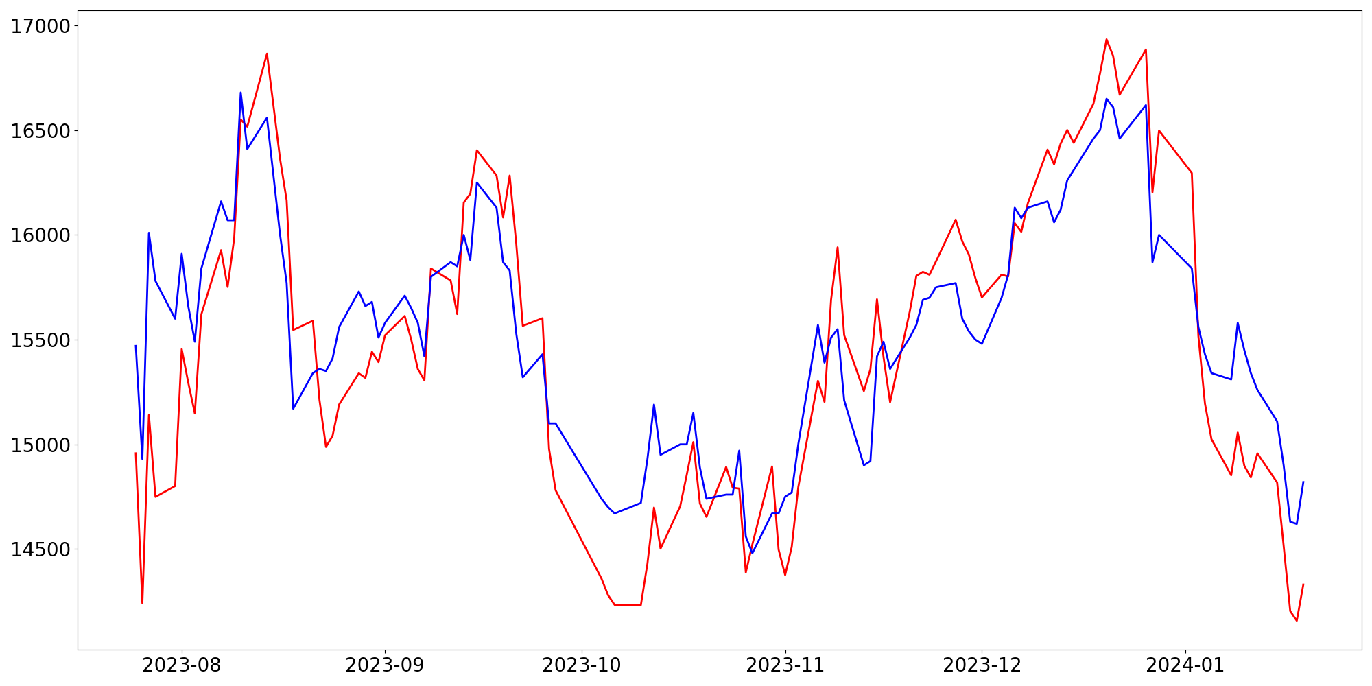 [ - : 실제값(종가) / - : 예측값(종가) ]
