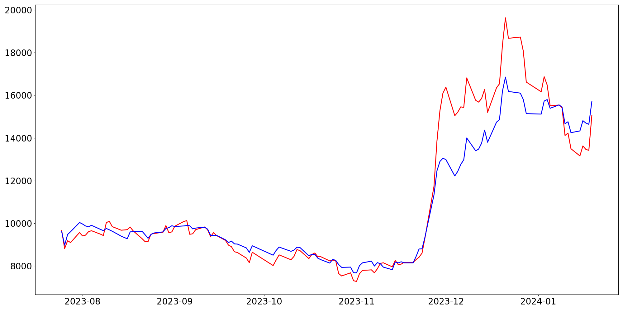 [ - : 실제값(종가) / - : 예측값(종가) ]