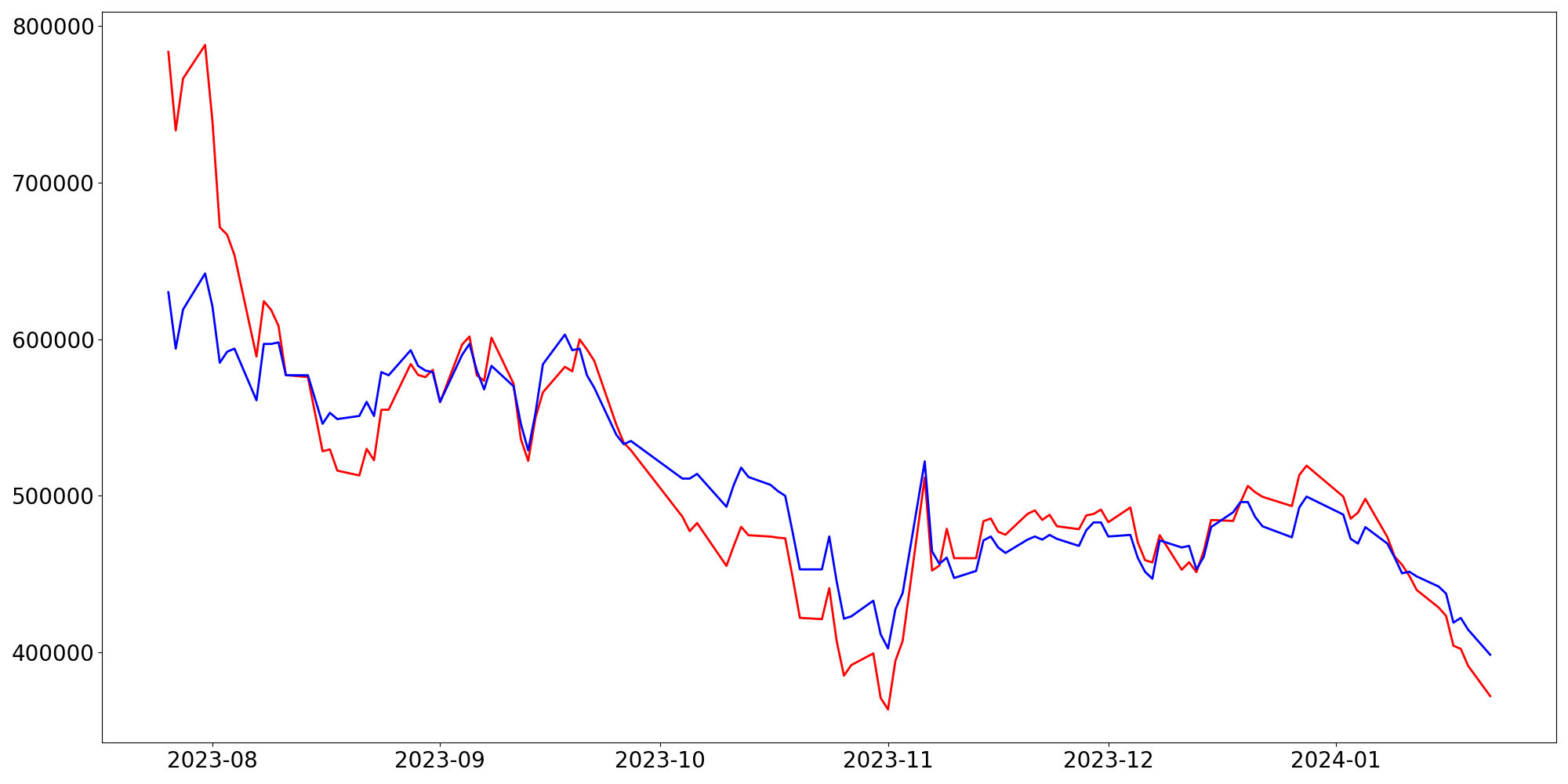 [ - : 실제값(종가) / - : 예측값(종가) ]