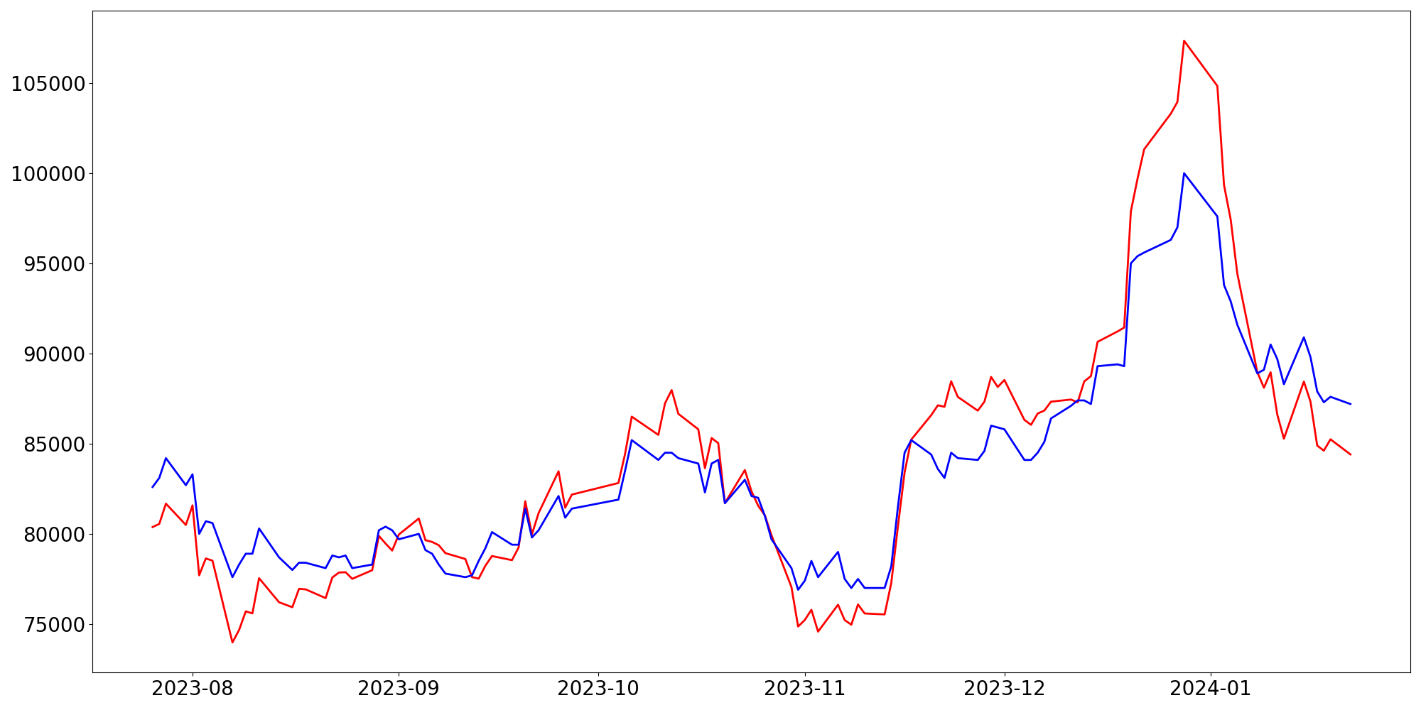 [ - : 실제값(종가) / - : 예측값(종가) ]
