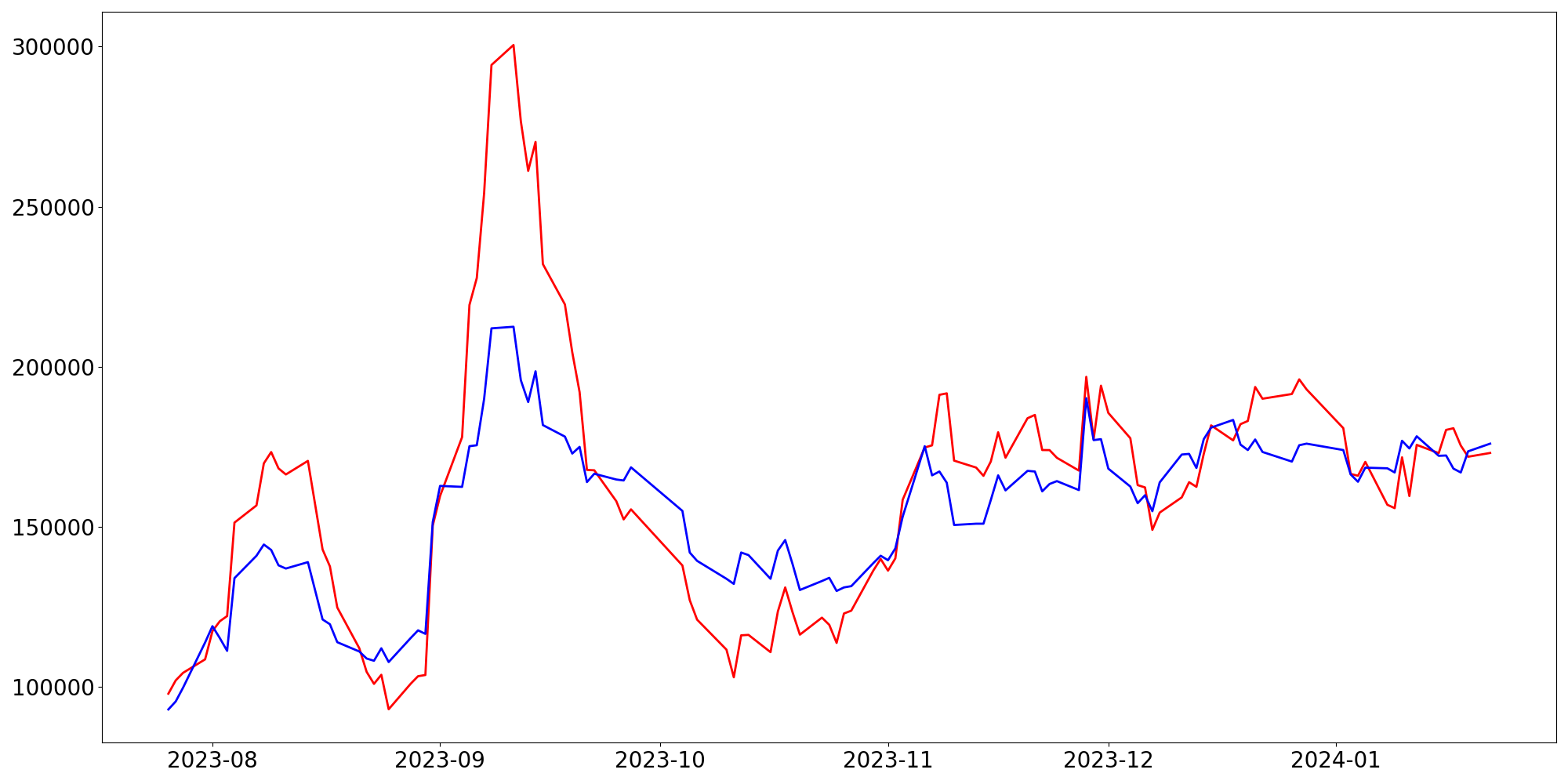 [ - : 실제값(종가) / - : 예측값(종가) ]