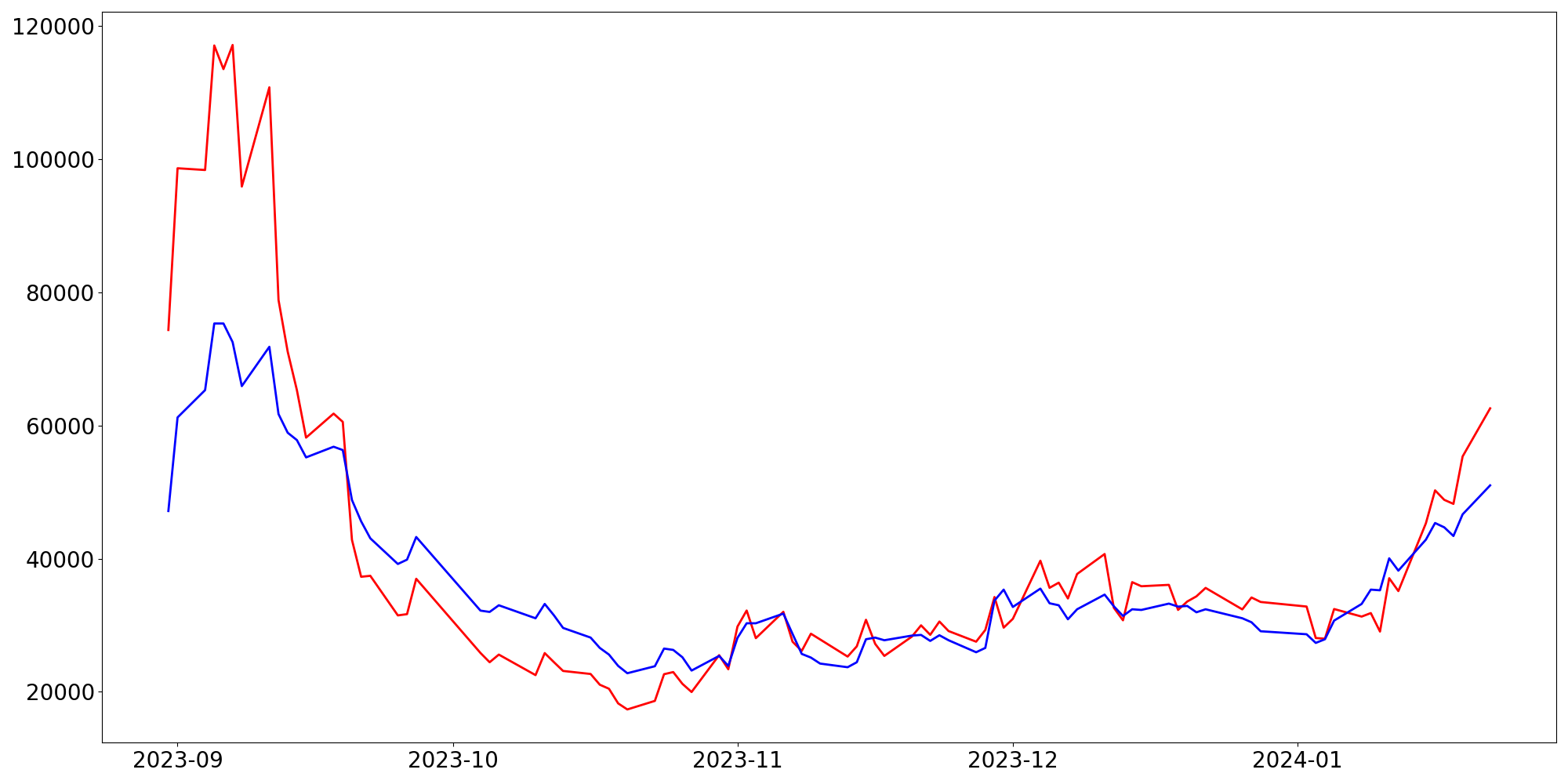[ - : 실제값(종가) / - : 예측값(종가) ]