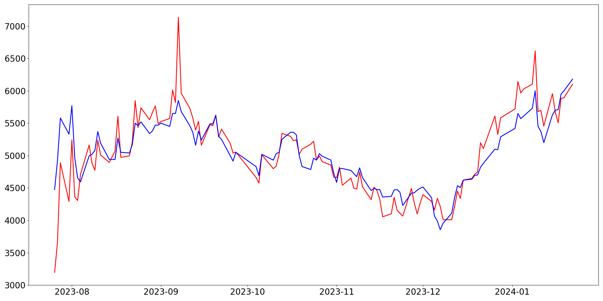 [ - : 실제값(종가) / - : 예측값(종가) ]
