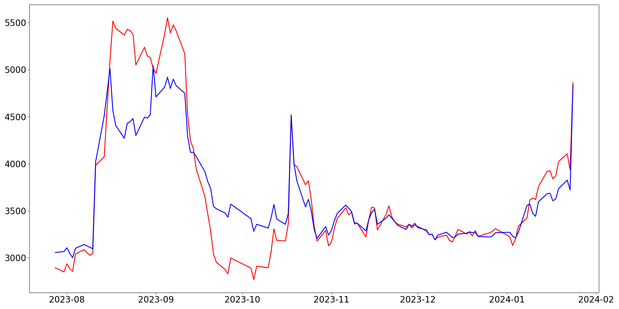 [ - : 실제값(종가) / - : 예측값(종가) ]