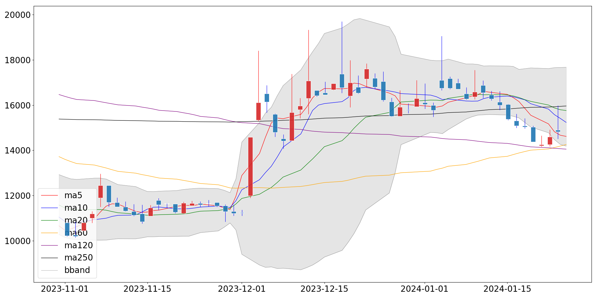 □ 장기 : 현재 종가가 장기(250일) 이동평균값(15,961원)을 하회 하여 장기적 추세 하락 중