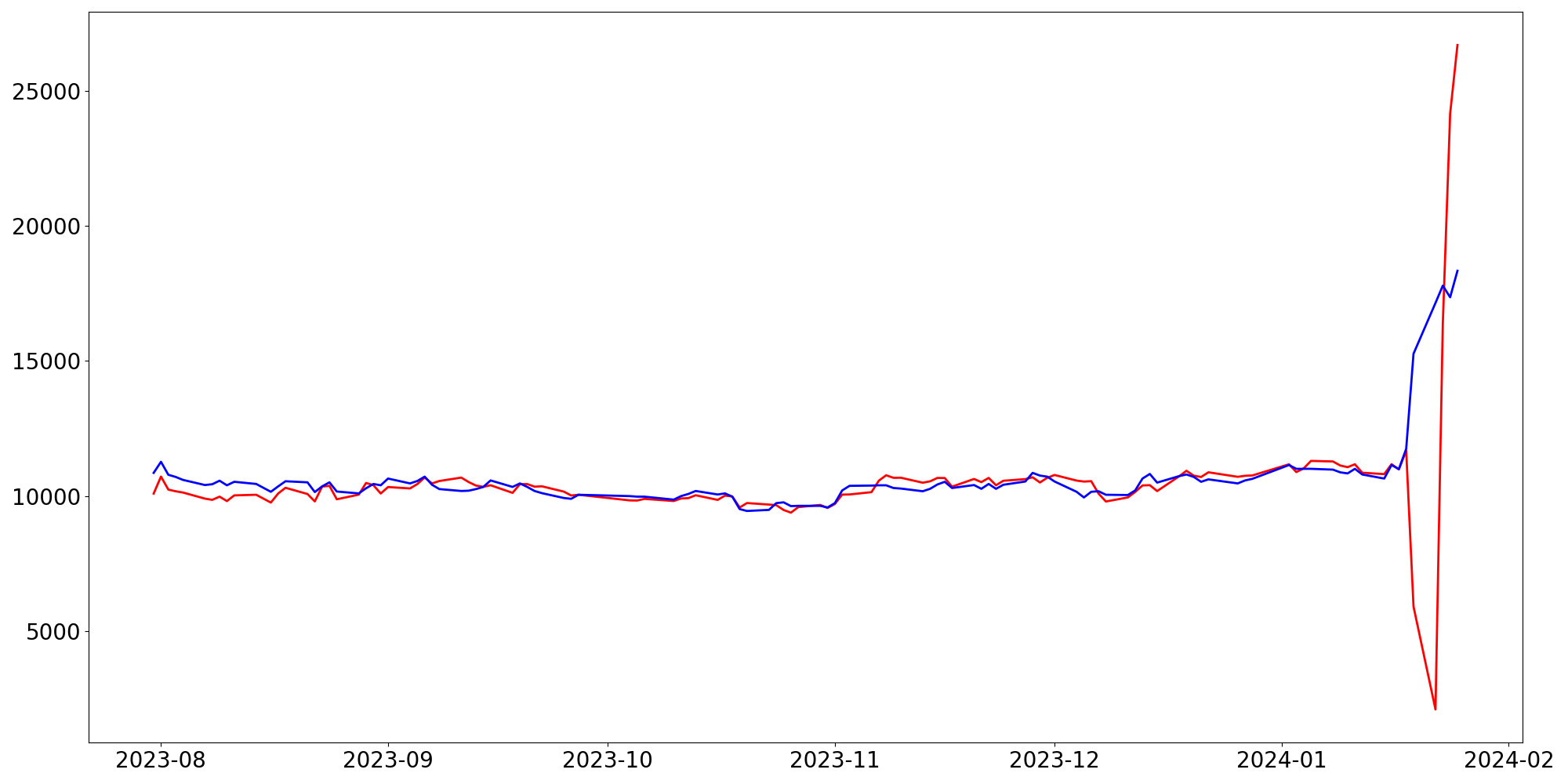 [ - : 실제값(종가) / - : 예측값(종가) ]