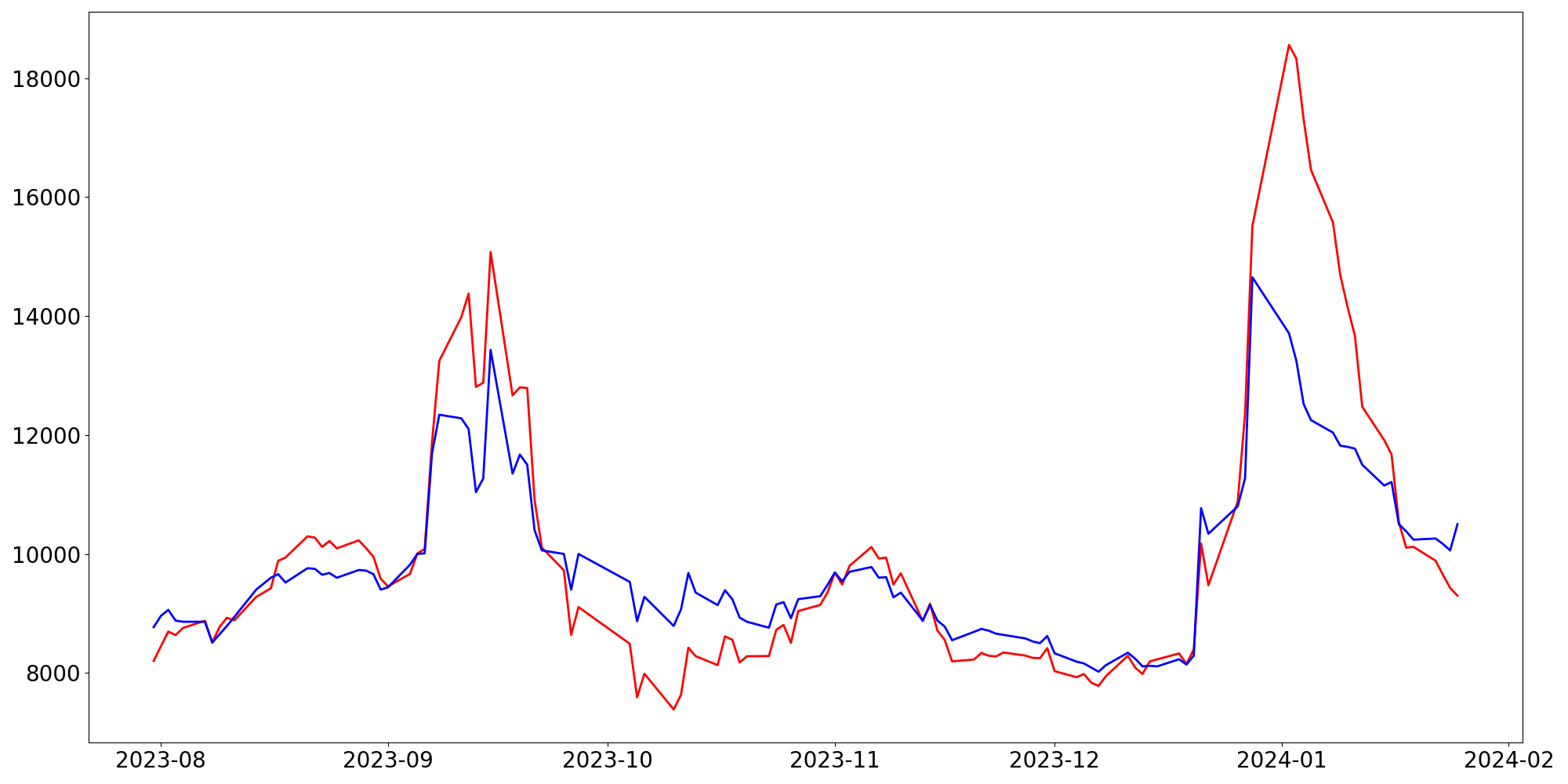 [ - : 실제값(종가) / - : 예측값(종가) ]