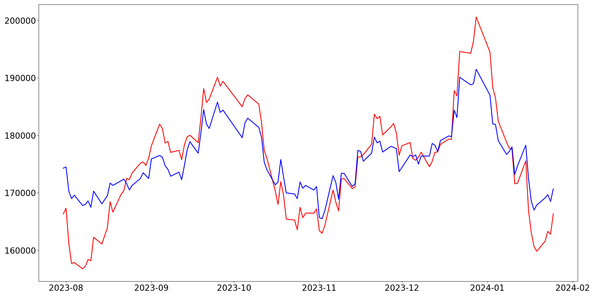 [ - : 실제값(종가) / - : 예측값(종가) ]