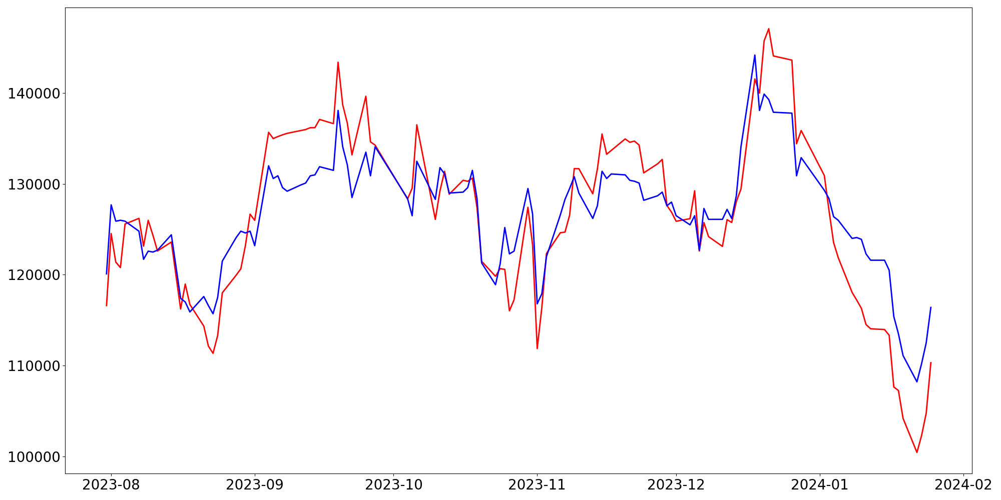 [ - : 실제값(종가) / - : 예측값(종가) ]